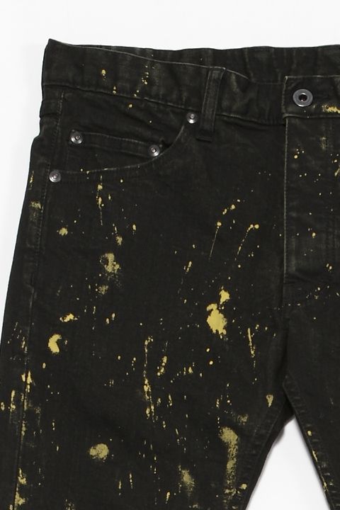 【50%OFFセール41,800円→20,900円】 ISAMU KATAYAMA BACKLASH イサムカタヤマバックラッシュ IRON SNOW COTTON ストレッチ ペンキ加工+ジャパンカーフタンニンレザーパンツ{-AEA} [1567-01-YEL]