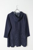 薄手のデニム素材にフラワーモチーフのカットワーク刺繍を施したフード付きチュニックトップ。