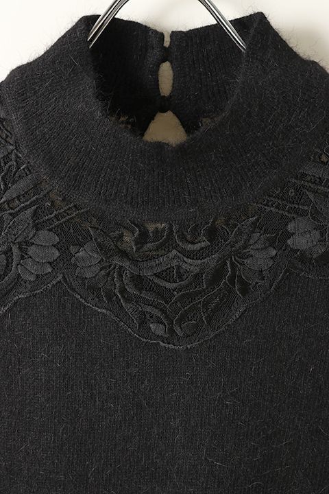 レース×毛足のあるアンゴラ混ハイゲージニットを合わせたコンビネーションニット。 レースの上に刺繍をする事で、控えめな透け感と凝った表情を表現しました。 ワンカラーでシンプルに仕上げた事で着合わせやすく、プリントスカートにもカラーボトムにも相性よくご活躍頂けます。 一枚でも華やかですが、ジャケットやコートのインナー使いにとしてもぜひご利用下さい。