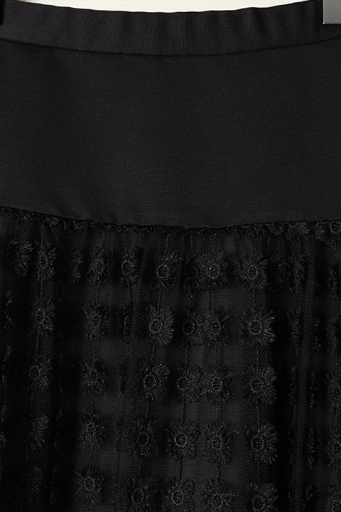 メッシュチュールをベースに、オリジナルの立体感のあるラメフラワージャガードを使用したロングスカート。 ウエストから腰回りがすっきり見えるように、張り感のきれいなタフタ地で切り替えた一枚です。 インナーと着丈差を設けてシアーな透け感を活かした事で、ロング丈でも重く見えずに合わせて頂けるポイント。 優美に広がる上品なシルエットが、女性らしさと華やかさを纏います。 ワンランク上のファッションを楽しめる、今夏の注目アイテムです。