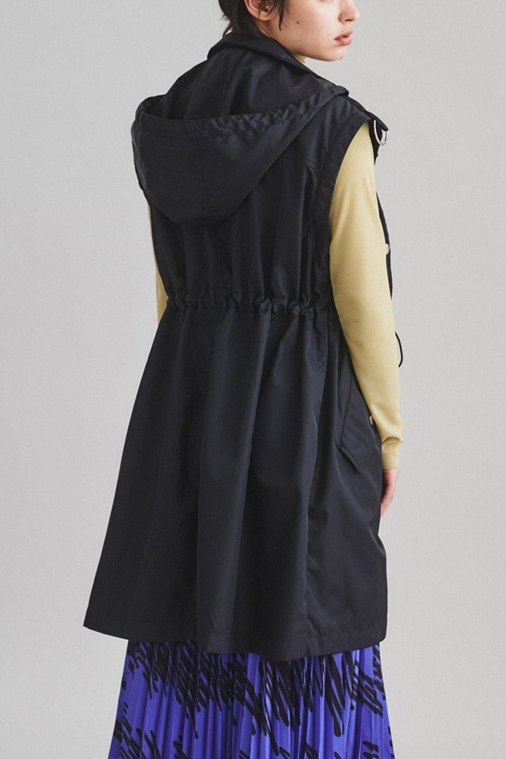 襟元は適度な高さで首元をしっかりカバーし、ウエストはドロストでシルエットの微調整が可能。