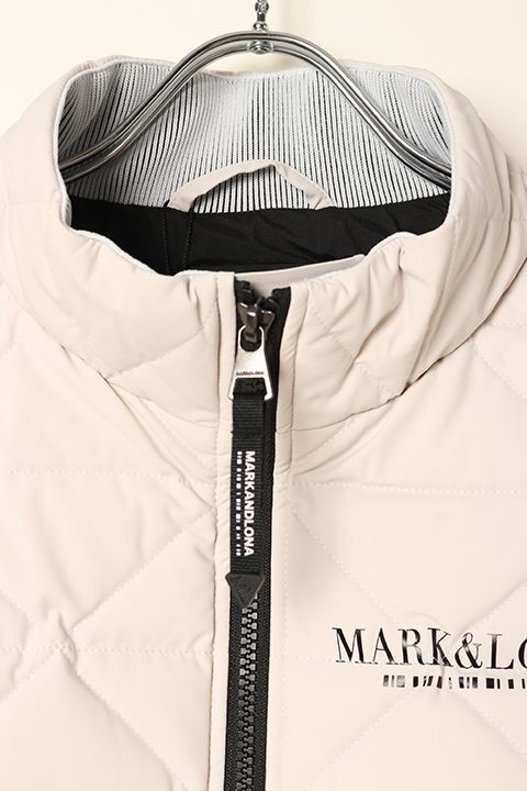 高機能素材を使用し、CODEのトライアングルモチーフを全面キルティングで表現したテクニカルダウンベスト。左胸にCODEロゴプリント、持ち出し部分にバーコードロゴプリント、背中にトライアングル型CODEロゴのシリコンワッペン、フロントファスナーの引き手にCODEロゴ入りテープをあしらいました。袖部分を2重構造にすることで、内側の袖が体へフィットし冷気の侵入をシャットアウト。また、内襟のリブもほどよいフィット感を生んで保温性をキープ。CODEらしいスタイリッシュな印象を保ちつつ、秋冬のゴルフシーンに対応する暖かさにこだわりました。身体に緩やかにフィットするソフトフィットシルエットです。