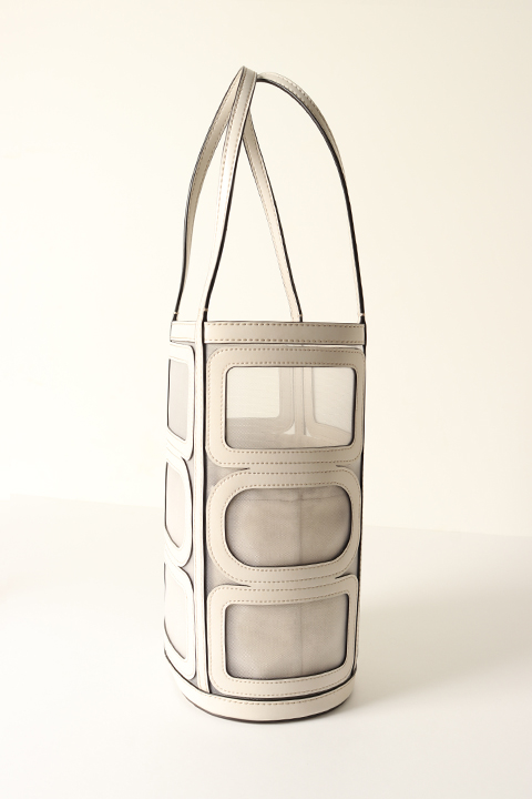 甘くなりがちなチュール素材とカットワークの掛け合わせを、タテ長フォルムで個性的に。大人が持てるデザインに施しました。