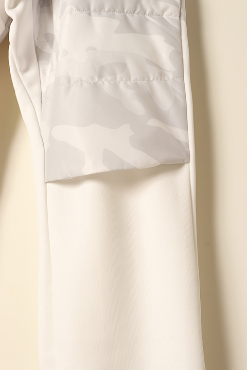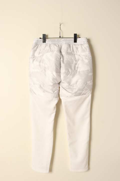 ホワイトはカモ柄、ブラックはペイズリー柄とカラーでグラフィックの異なる中綿パンツ。