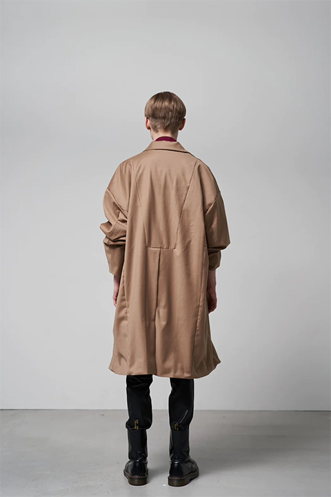 オーバーサイズなシルエットのコートになります。バックスリットが深く、を感じさせない軽やかなお見た目が特徴です。素材感も冬物としてはサラッとした質感で、長い季節でご活躍いただけそうです。袖の内側には隠しリブが施されており、風が入って来ないような仕様になっております。ユニセックスかつサイズはワンサイズ、カラーはBLACK/MOCHA/PARETEの3色展開です。