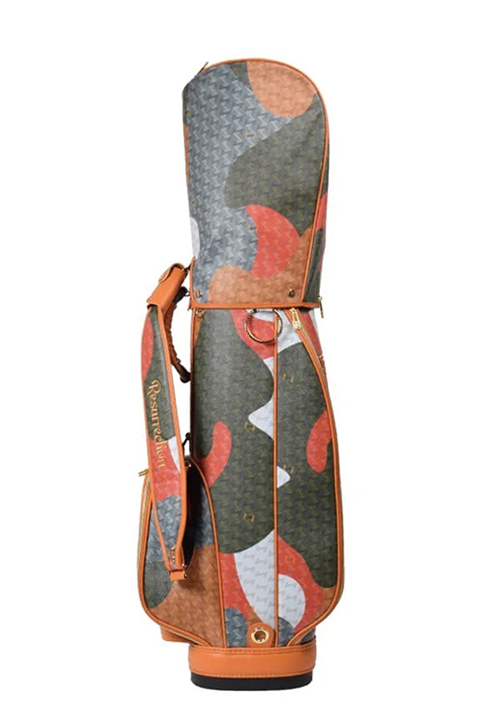 この特殊なデザインの生地でキャディバッグを作る際、パーツごとにランダムに裁断して組み立てていく事で、1本1本違ったデザインとして完成致します。