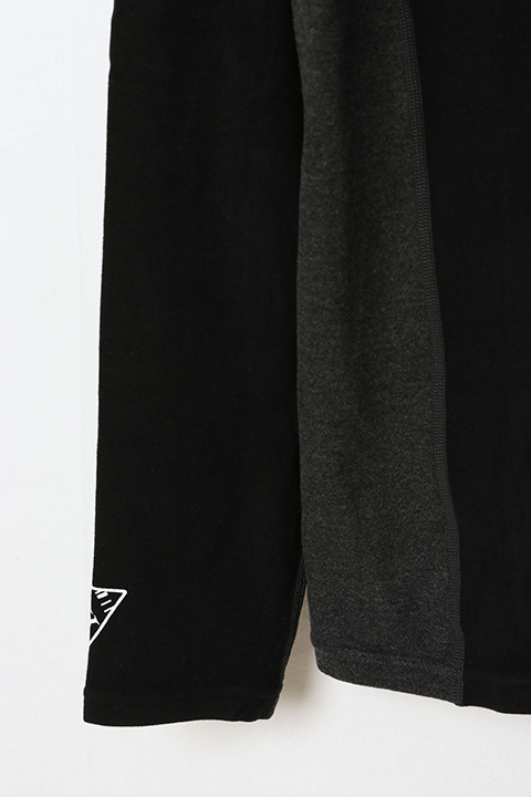 素材には、マイクロアクリル糸とマイクロレーヨン糸を使用したスウェード調素材が採用されており、見た目の高級感だけでなく、アクリルの保温性とレーヨンの発熱性を活かした機能素材です。単独で着用するのはもちろん、インナーレイヤーとしても適しており、長いシーズンにわたって活躍します。さらに、静電気の軽減効果を持つミシン糸であるエレカット(R)を使用しています。