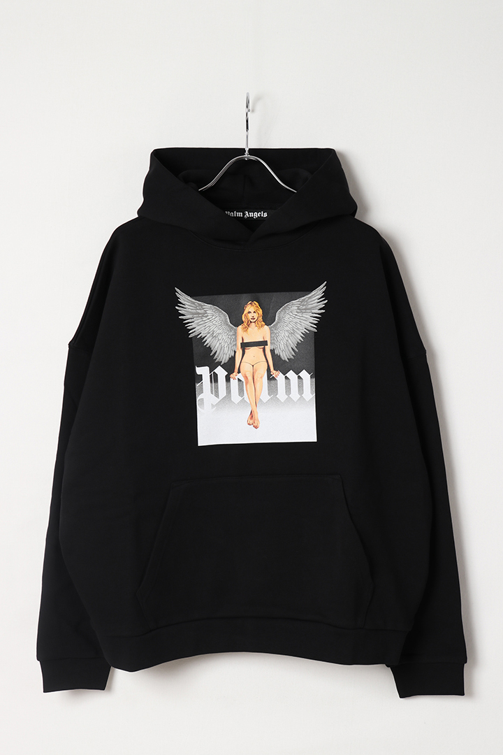 ビンテージのピンナップからインスピレーションを受け、Palm Angelsの世界の要素を融合させたユニークなオリジナルプリント。フロントに天使の羽を持つピンナップのイメージと白のロゴがプリントされたメンズブラックパーカー。