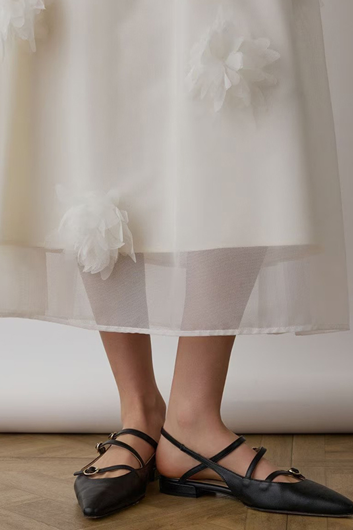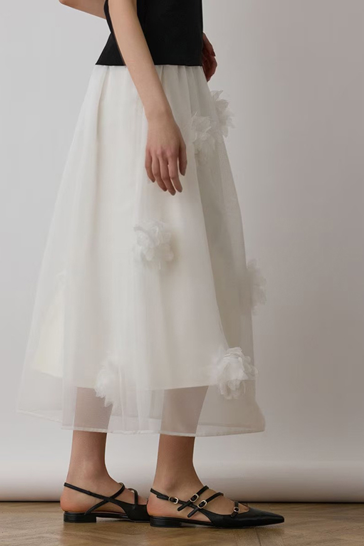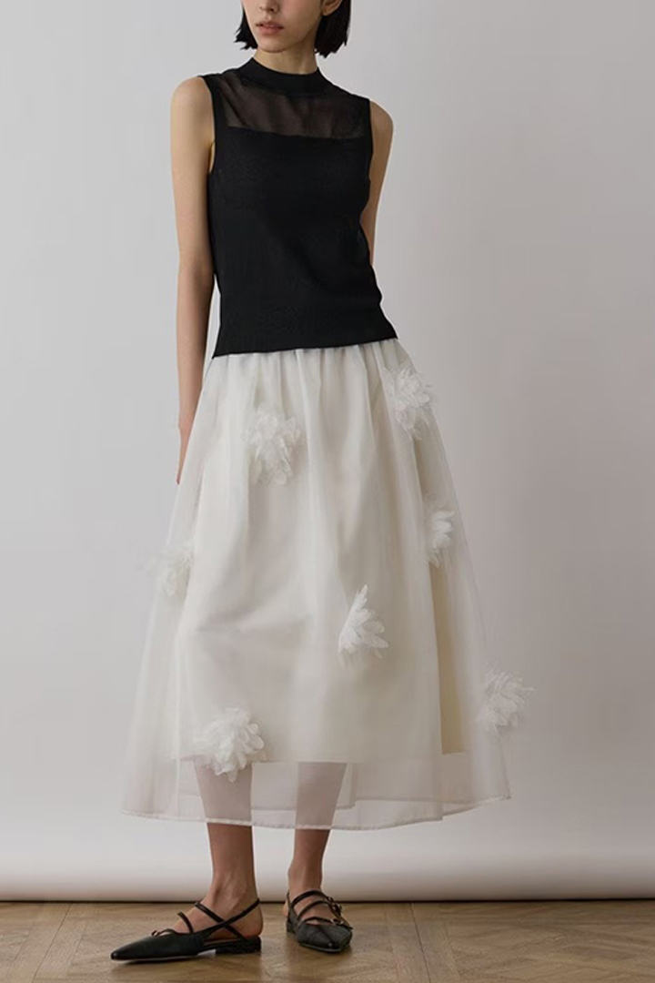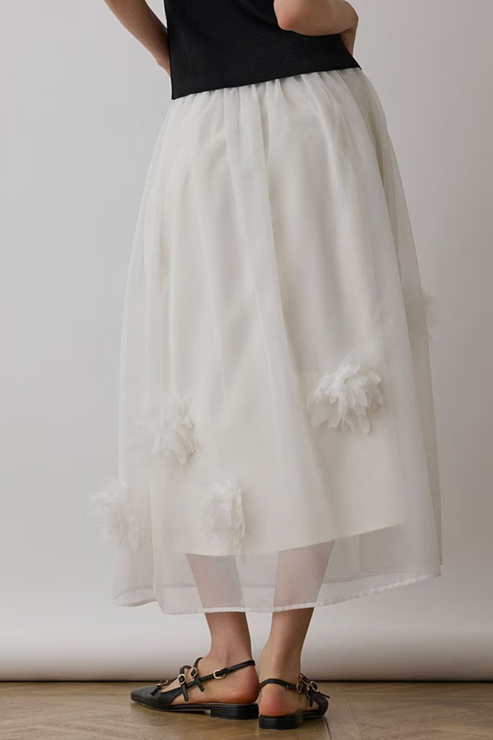光沢感のあるメッシュ生地にコサージュを手付けしたギャザースカート。