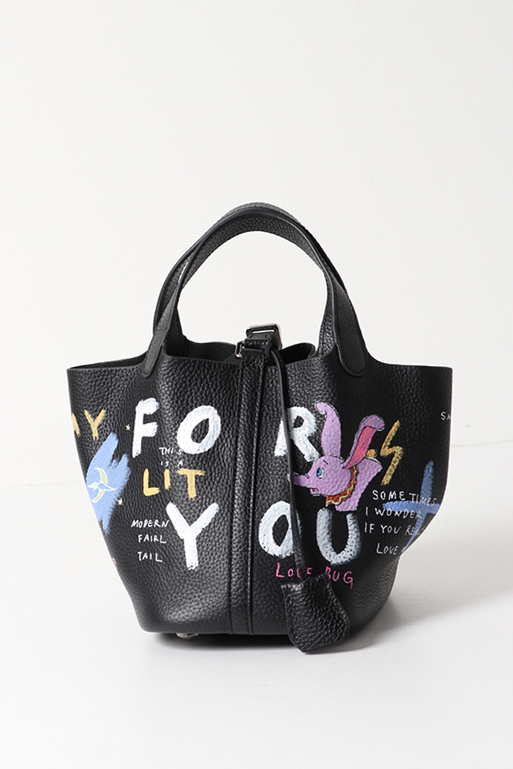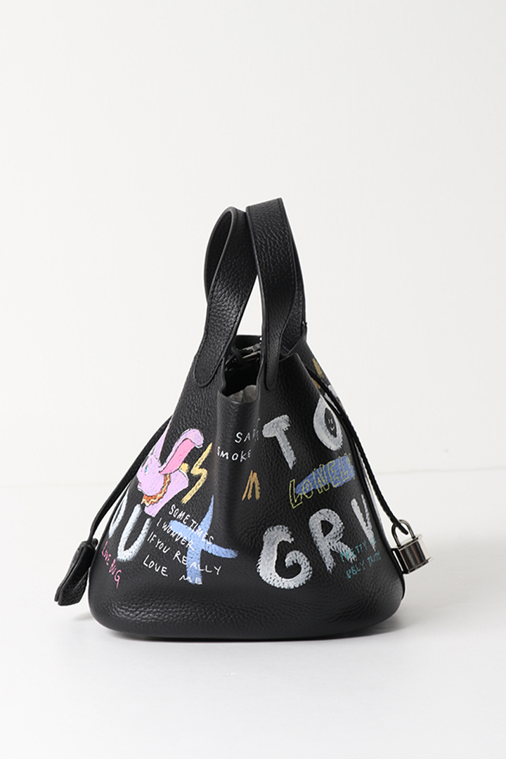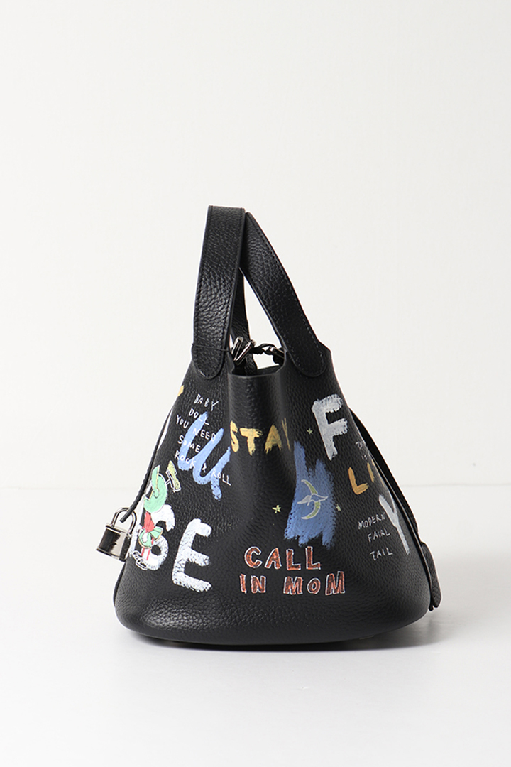 アーティスト、乾シンイチロウ(Shinichiro Inui)によりハンドペイントが施されたレザーバッグ。 【Cube Bag / size L】のひと回り小さいサイズです。
