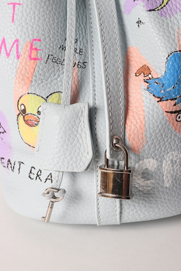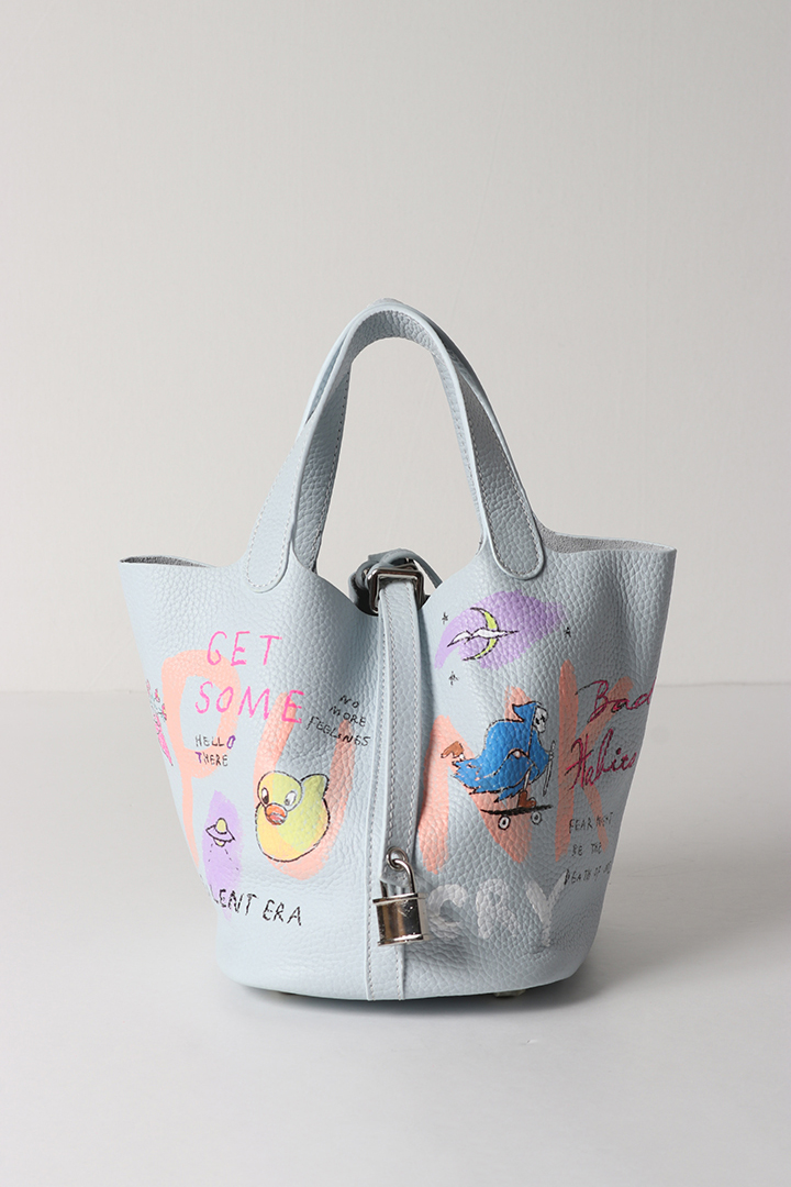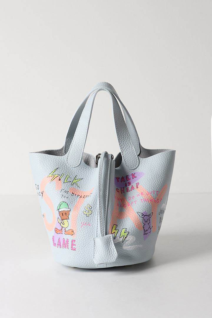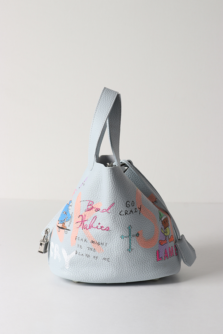 アーティスト、乾シンイチロウ(Shinichiro Inui)によりハンドペイントが施されたレザーバッグ。 【Cube Bag / size L】のひと回り小さいサイズです。