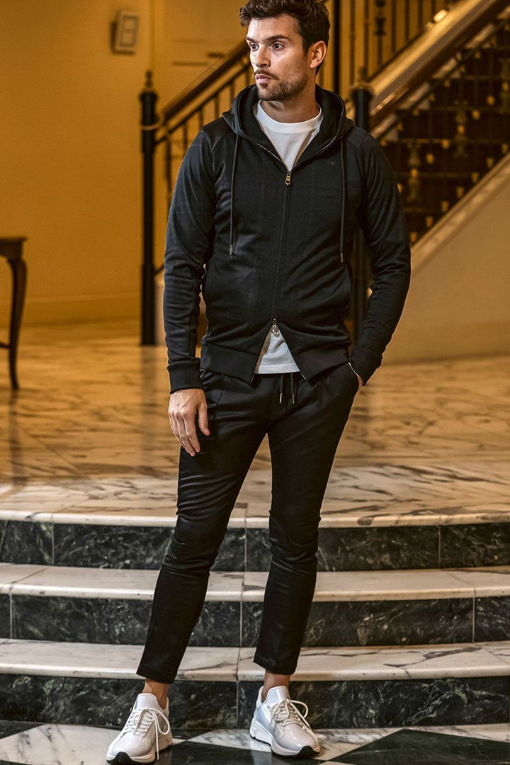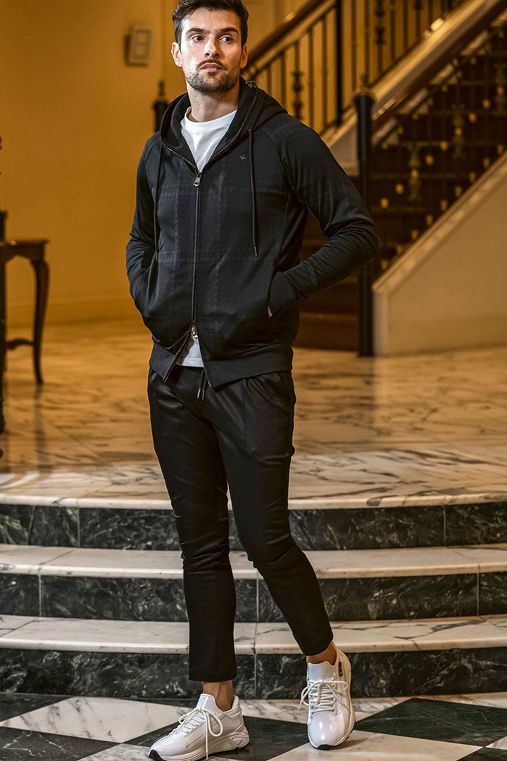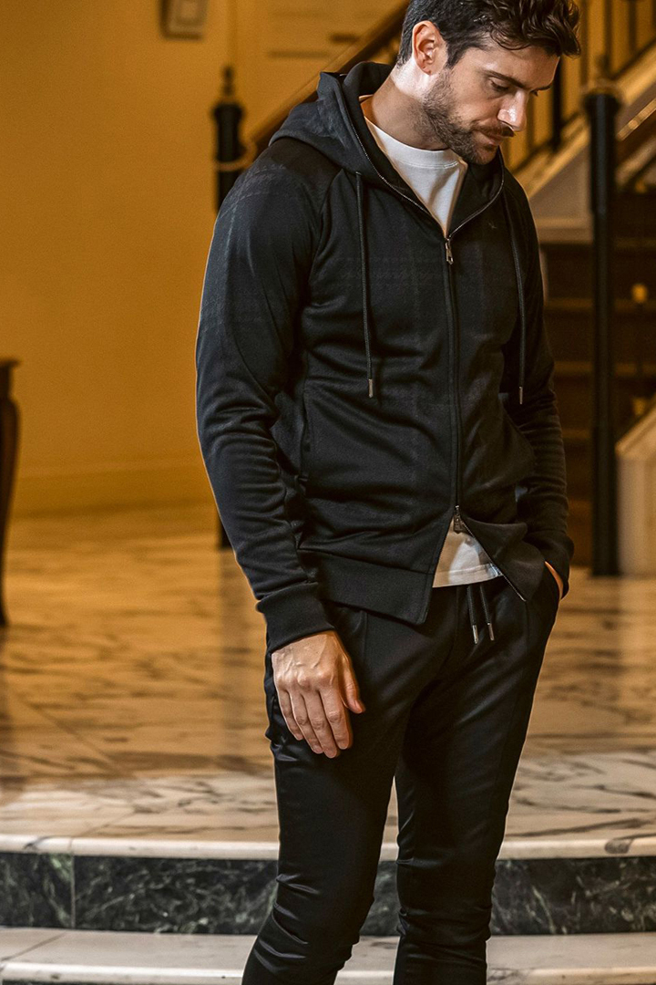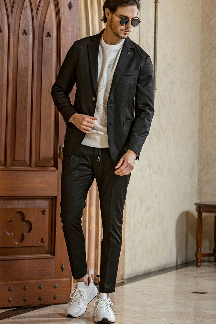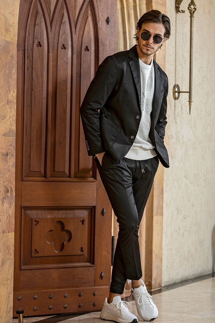 同素材のジャケットと合わせれば、統一感のあるモダンなセットアップスタイルに。