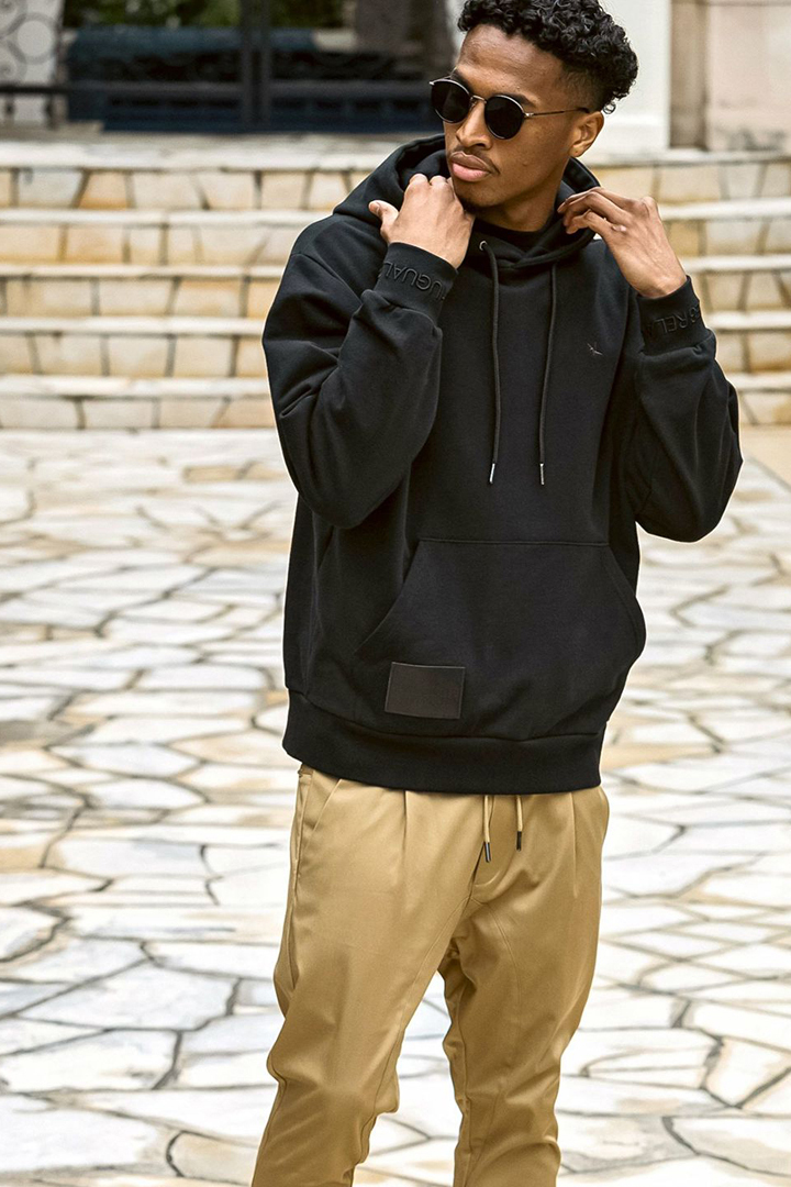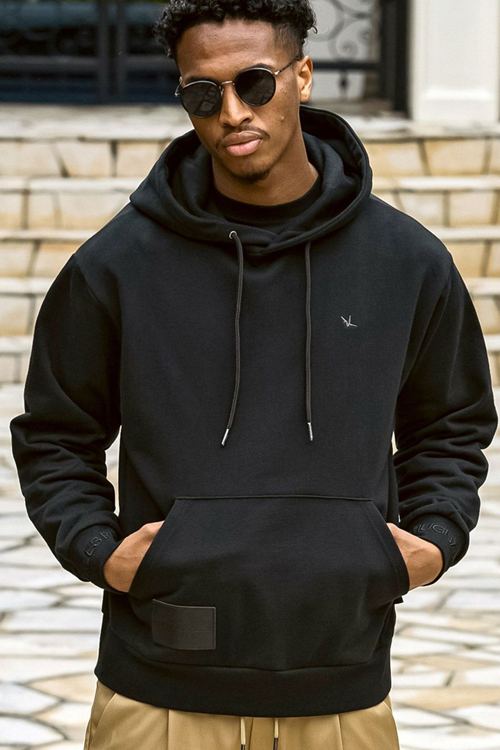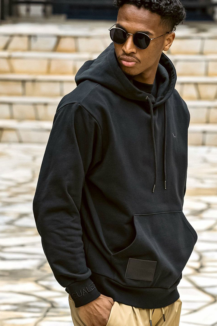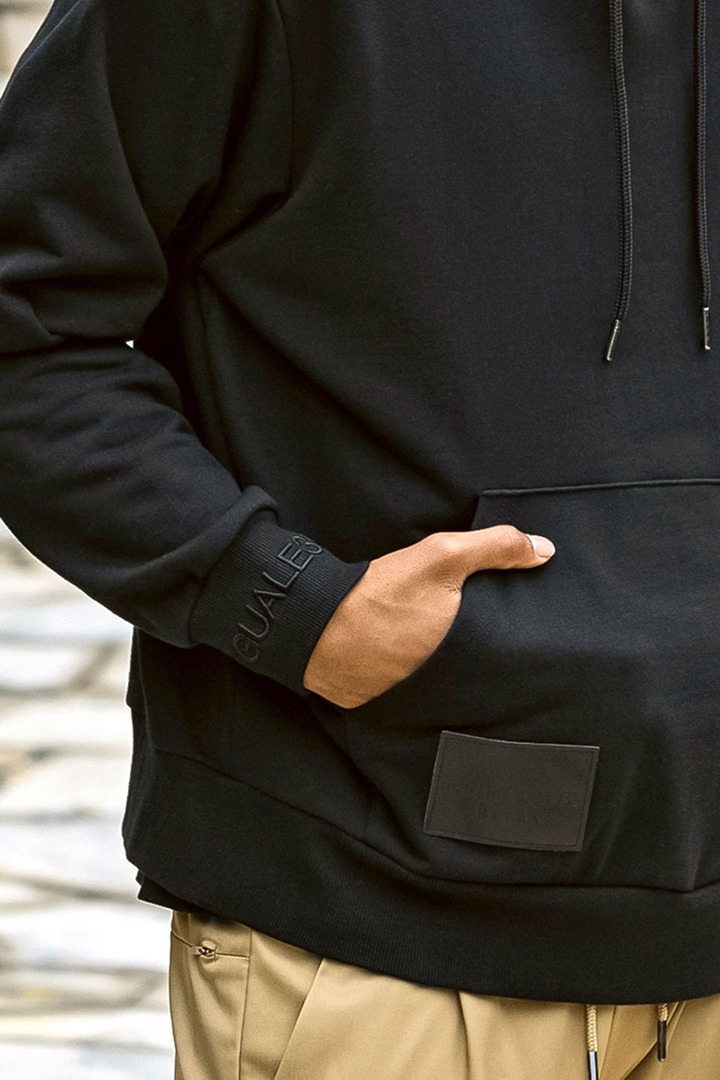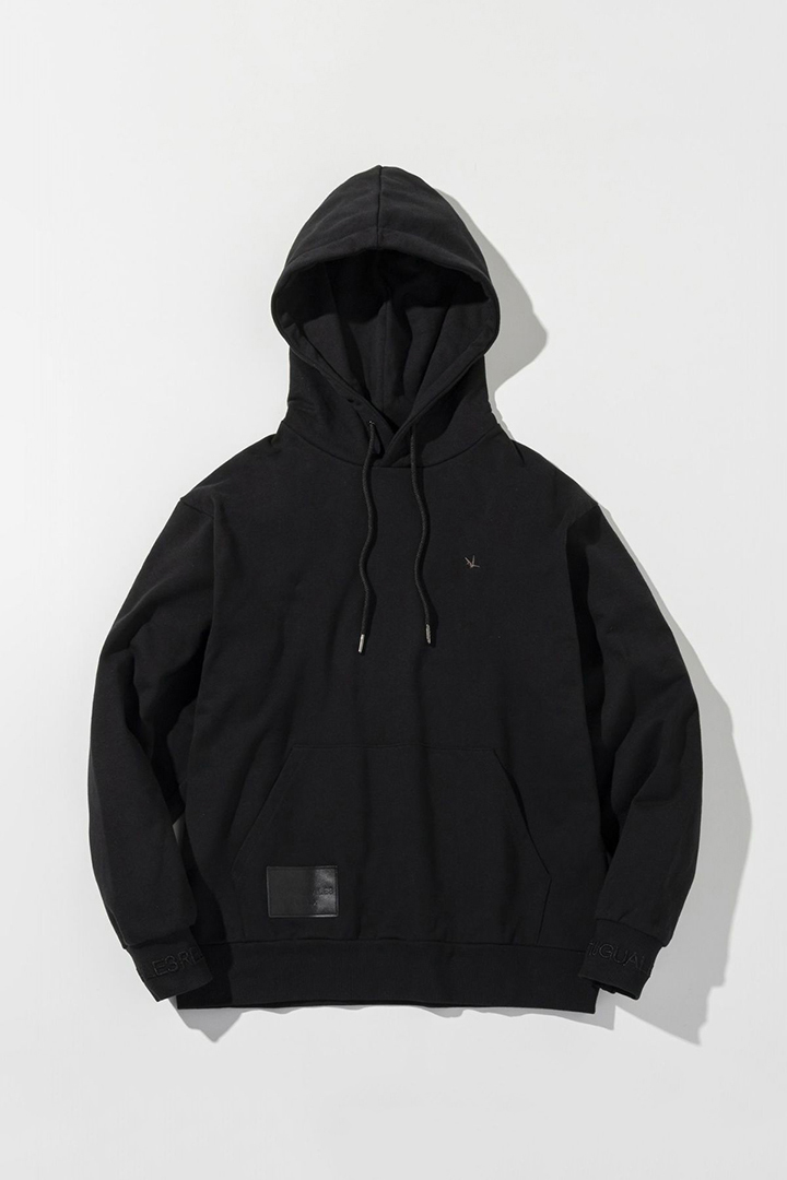 フェイクレザーに箔押しでブランドロゴを刻んだオリジナルのパッチがアクセントのプルフーディー。