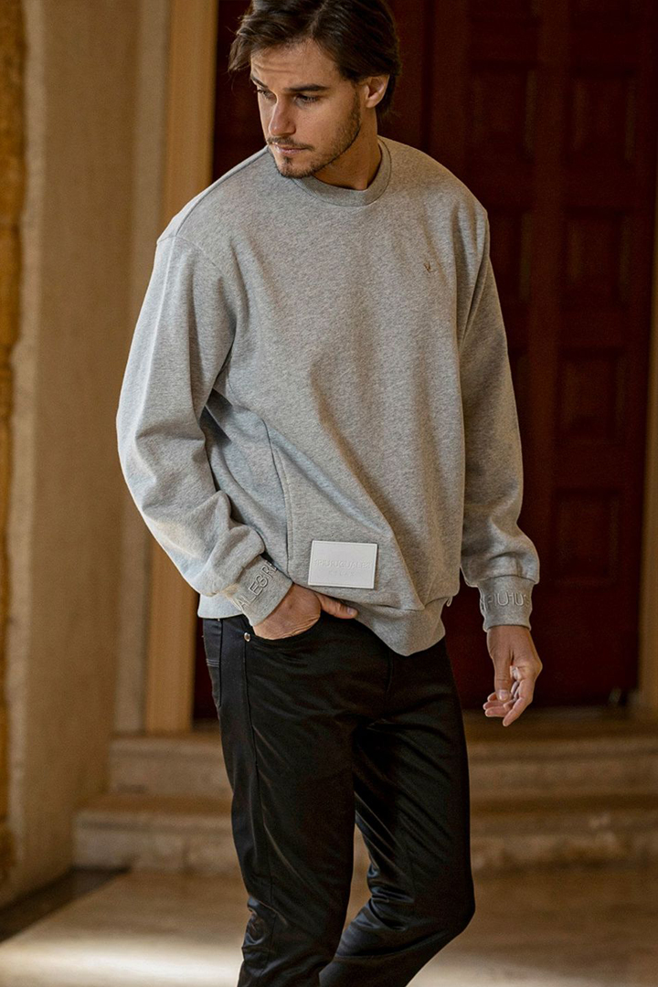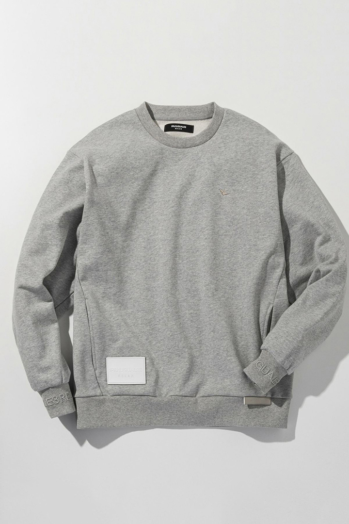フェイクレザーに箔押しでブランドロゴを刻んだオリジナルのパッチがアクセントのクルーネックトレーナー。