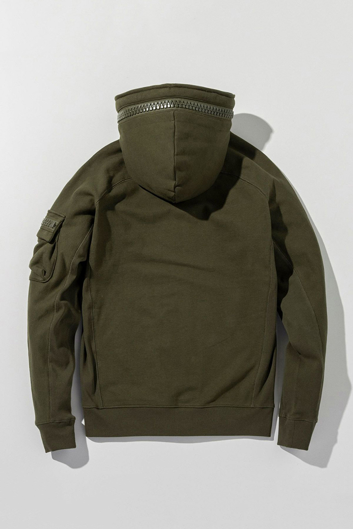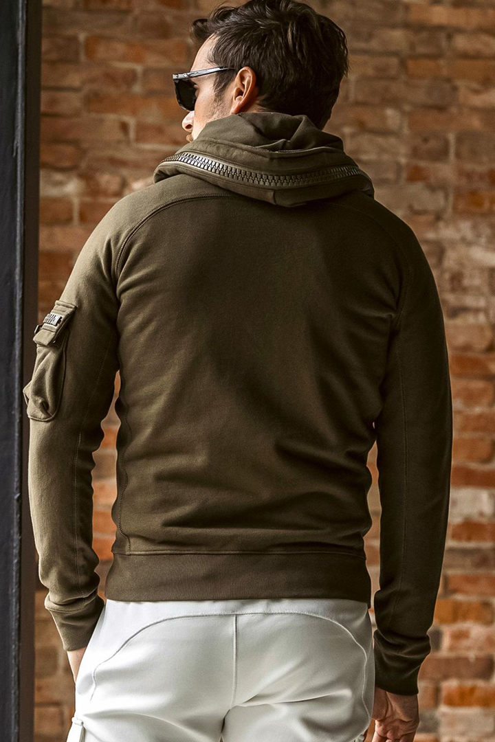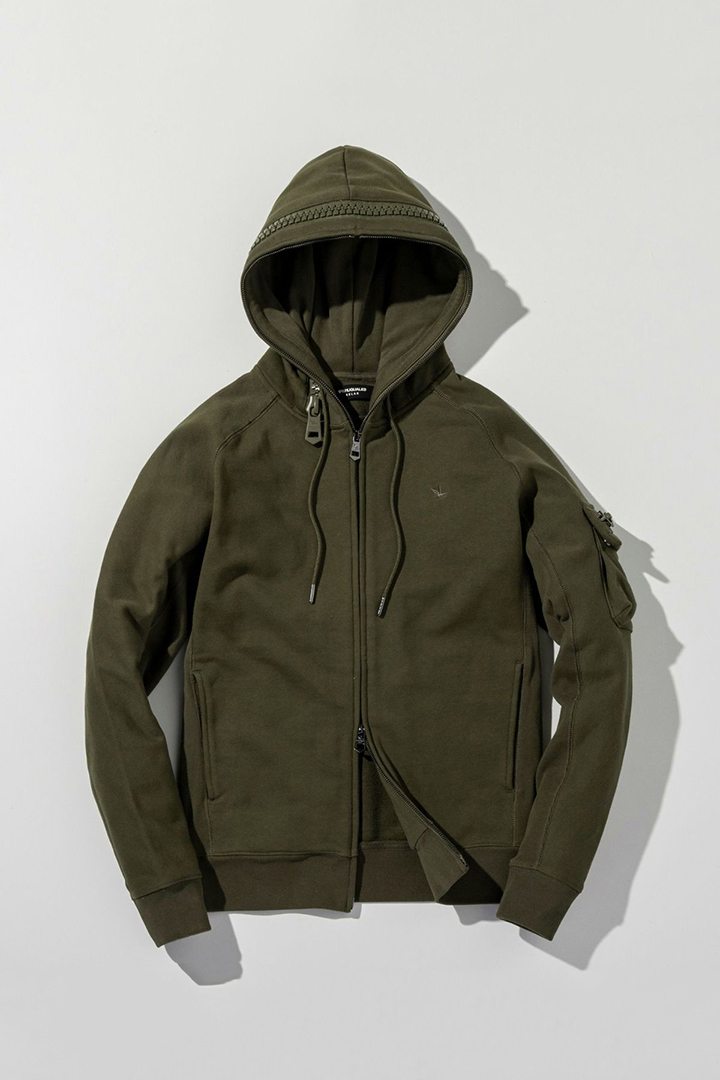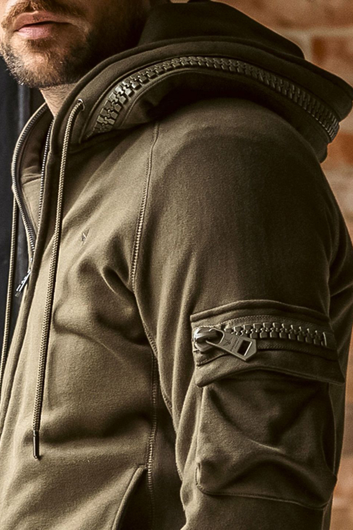 左袖にカーゴポケットを配置したジップアップフーディー。