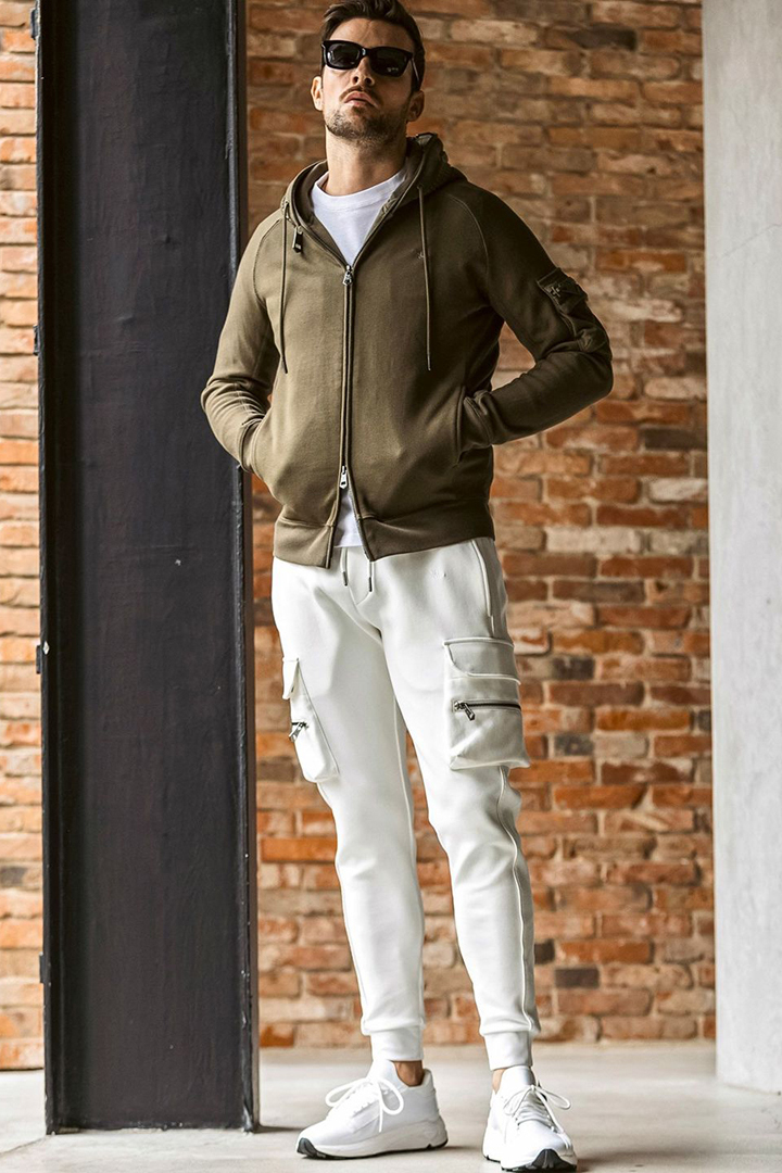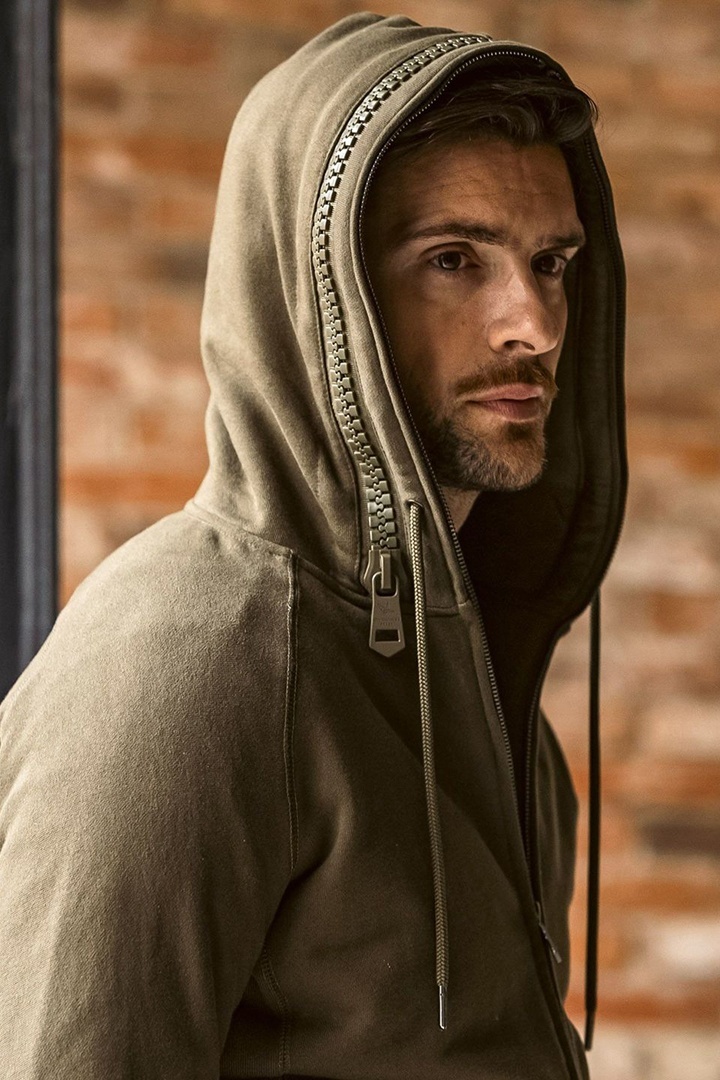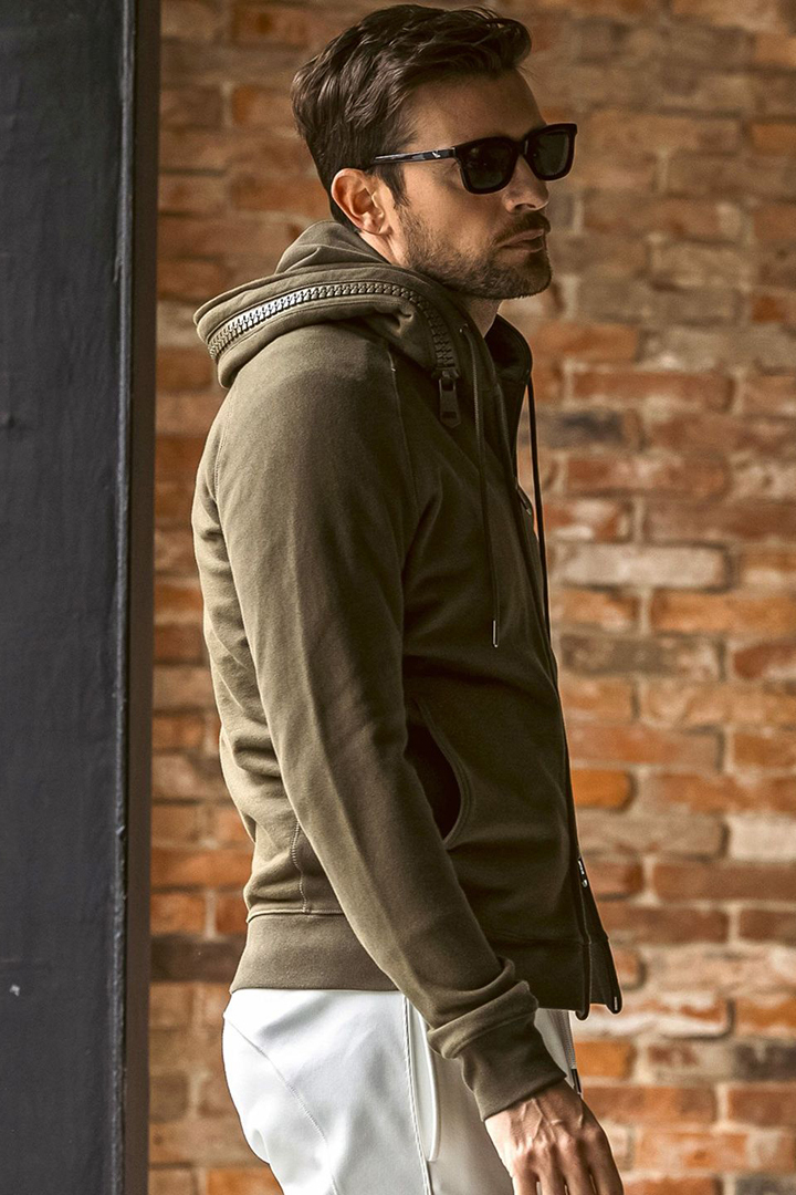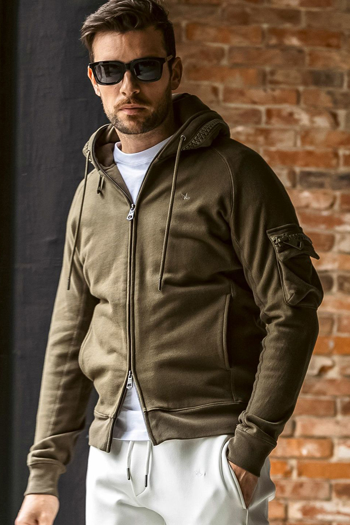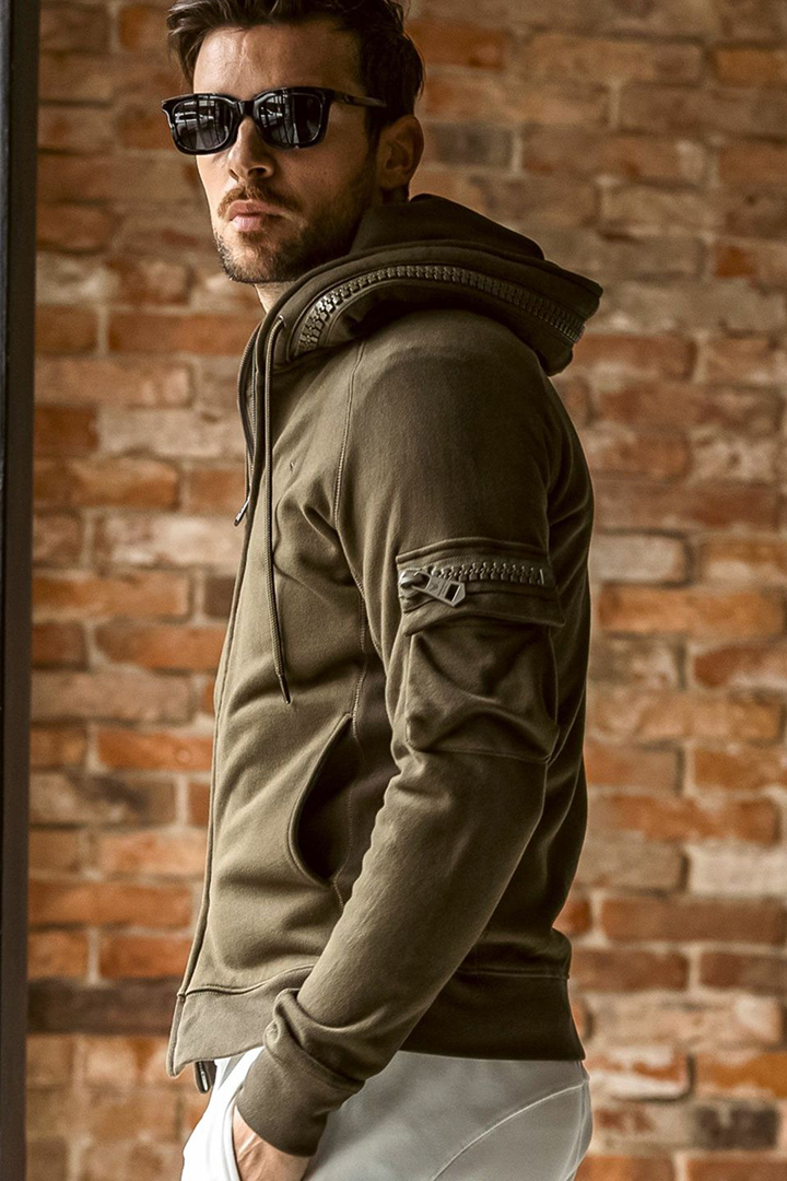 左袖にカーゴポケットを配置したジップアップフーディー。