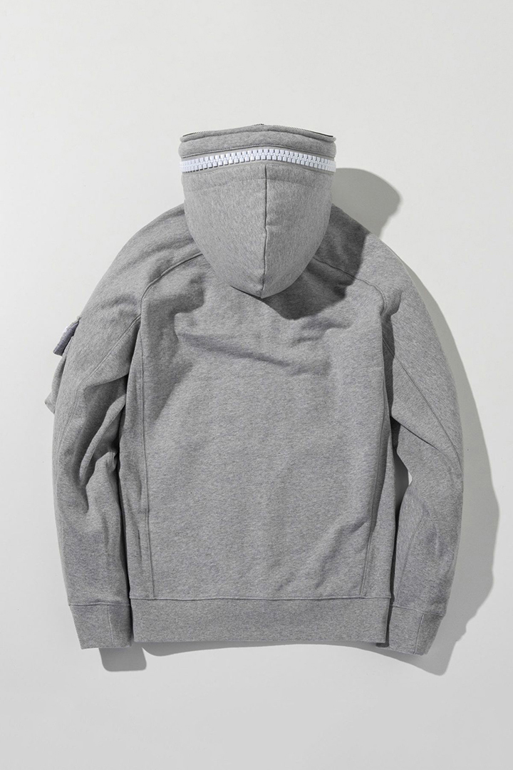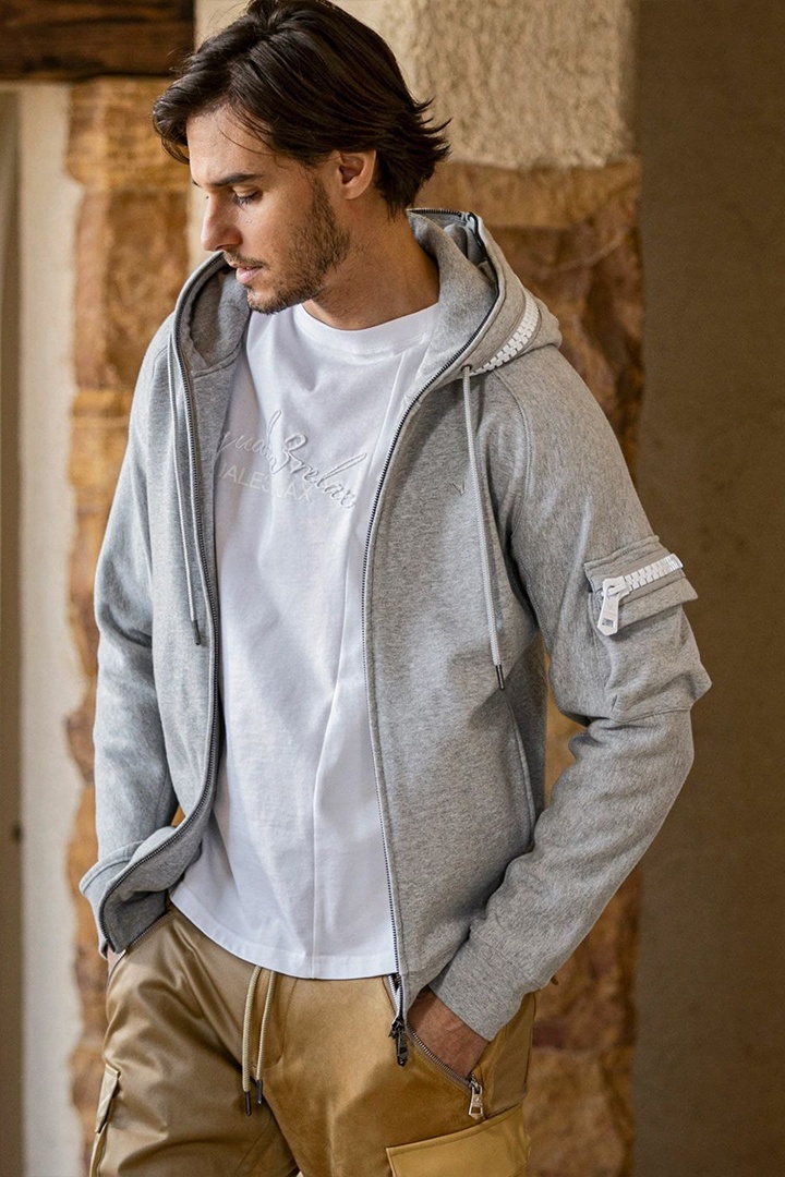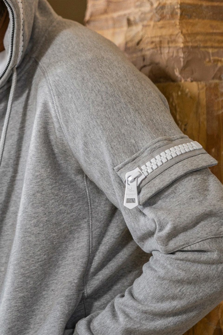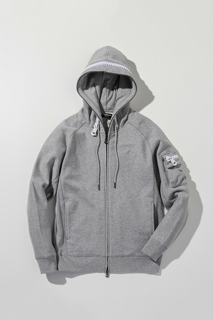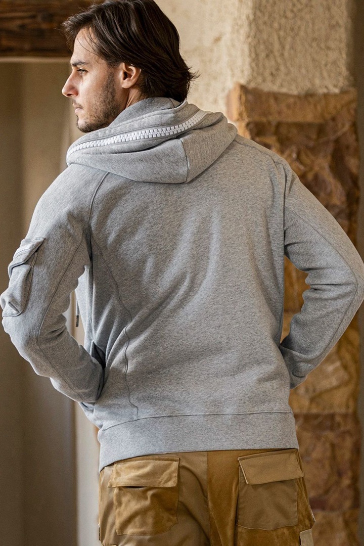 左袖にカーゴポケットを配置したジップアップフーディー。