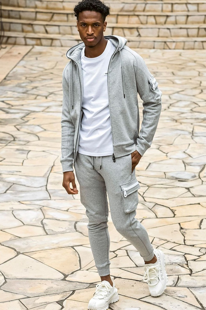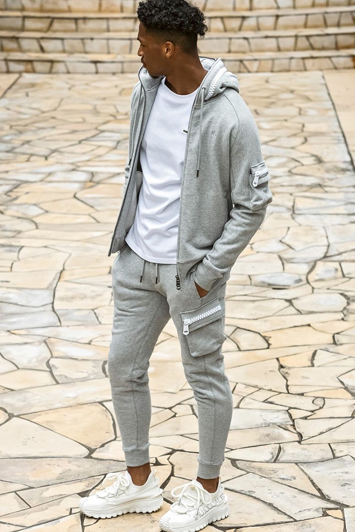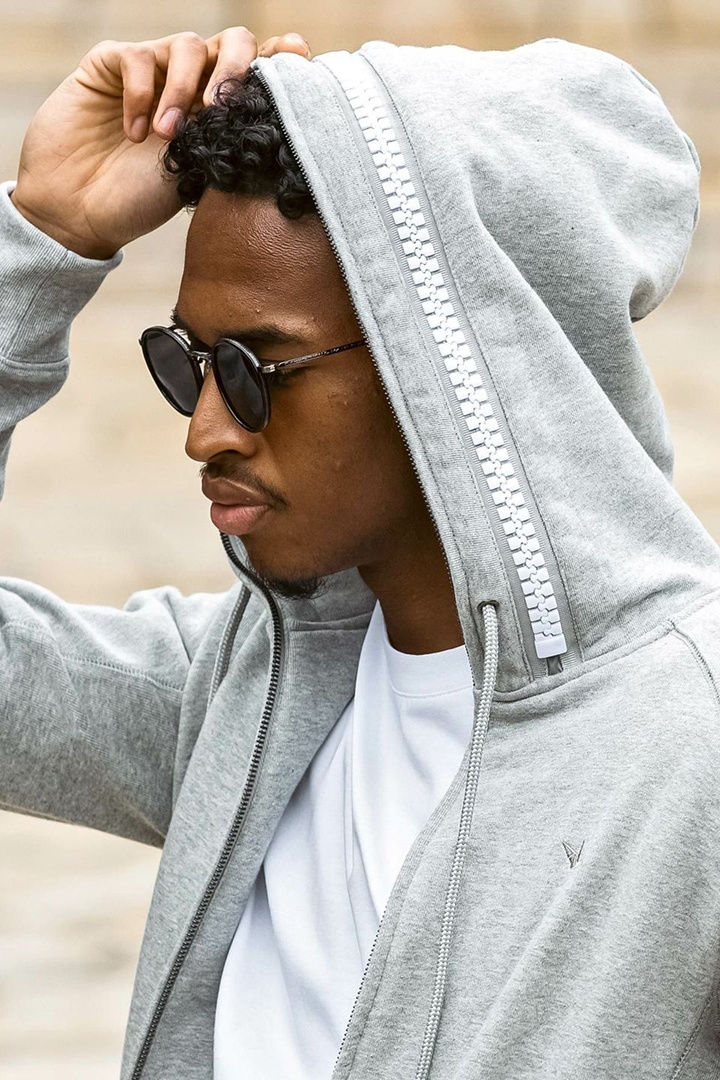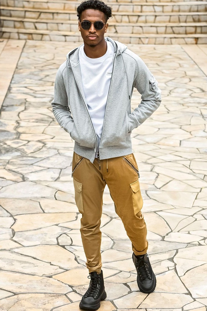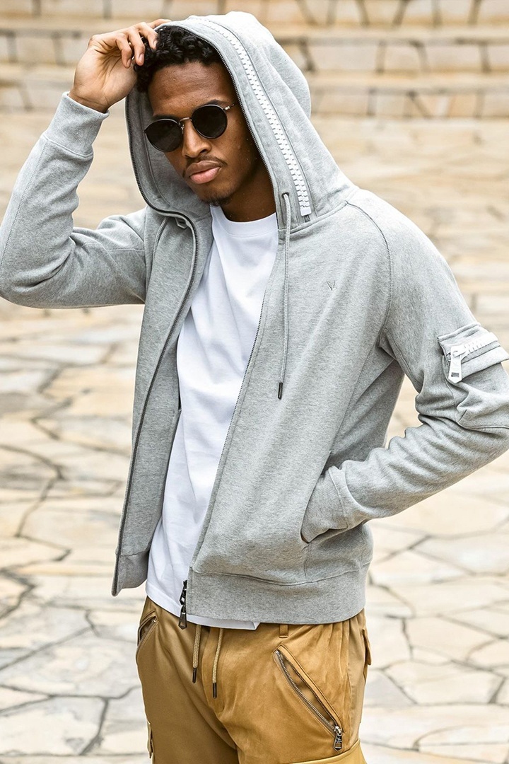 左袖にカーゴポケットを配置したジップアップフーディー。