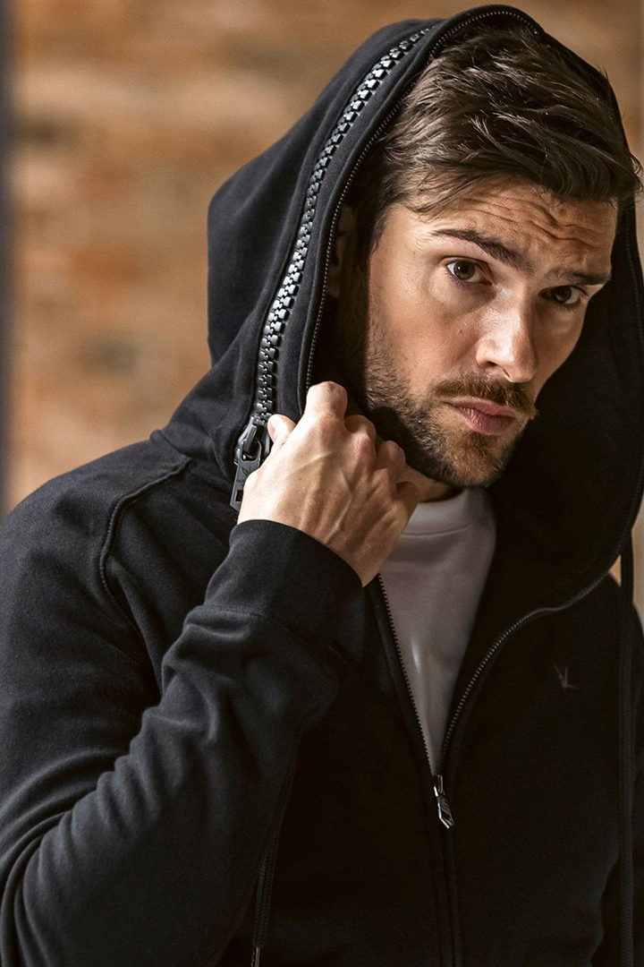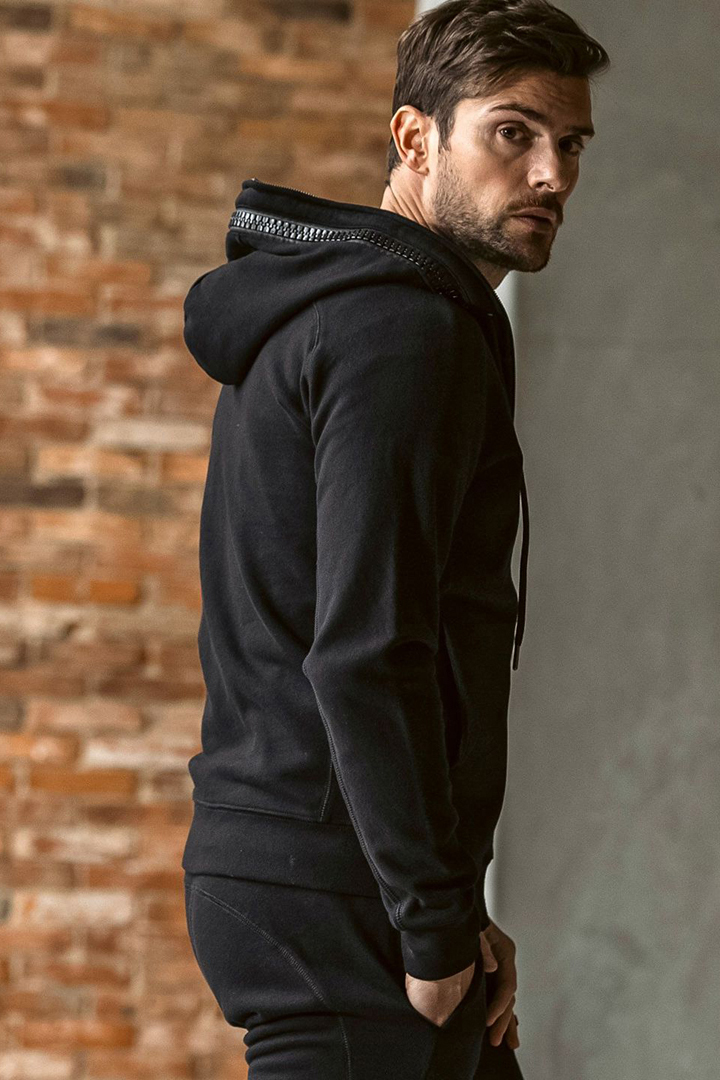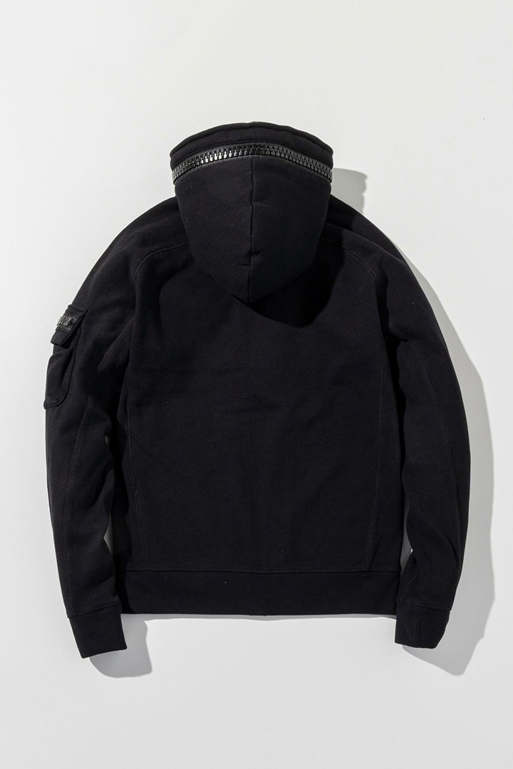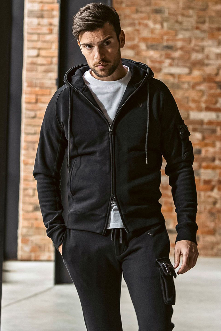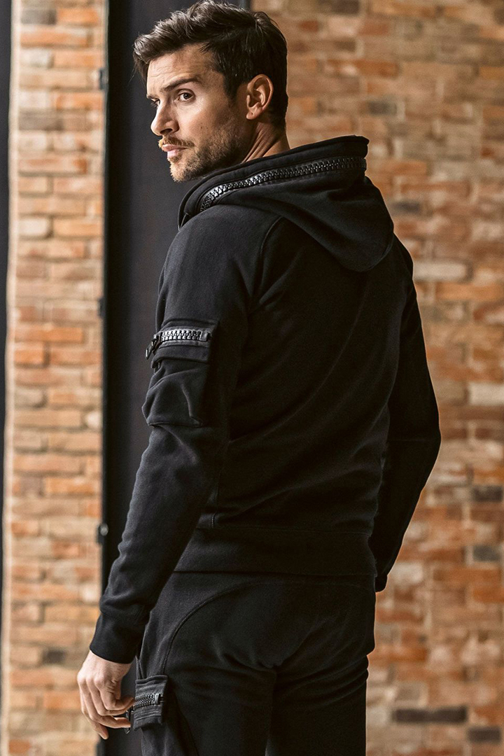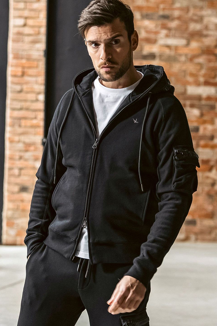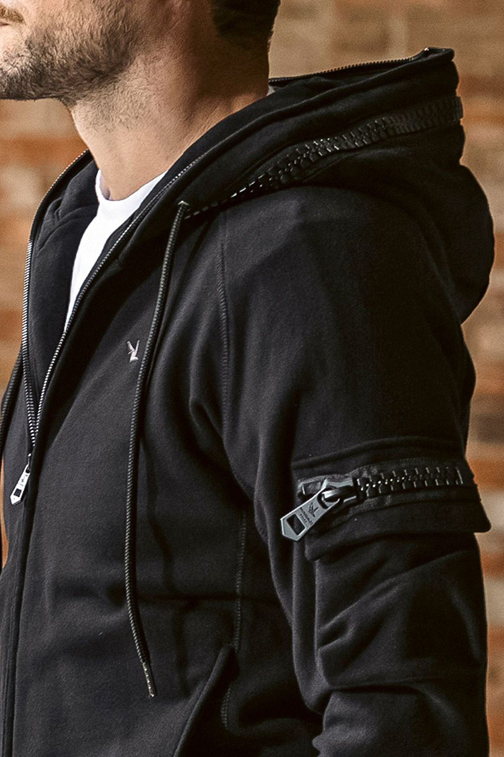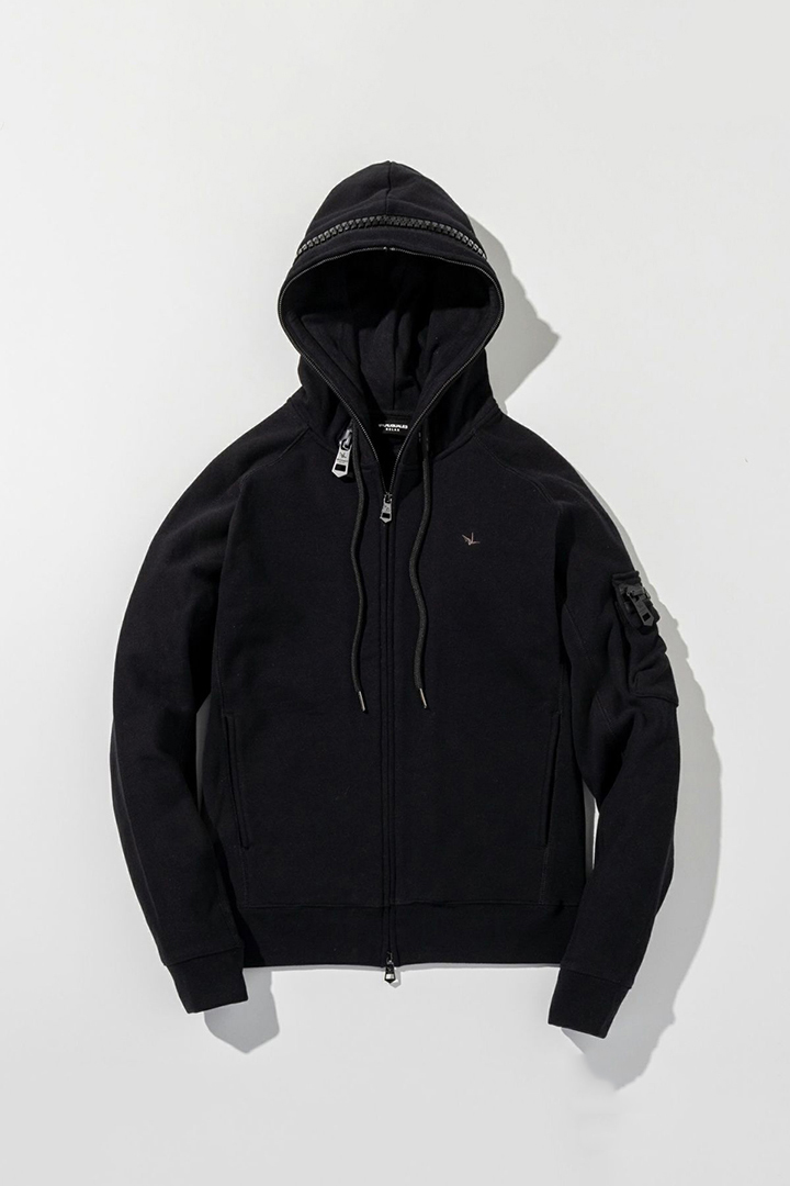 左袖にカーゴポケットを配置したジップアップフーディー。