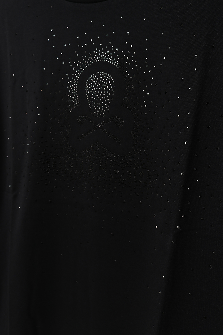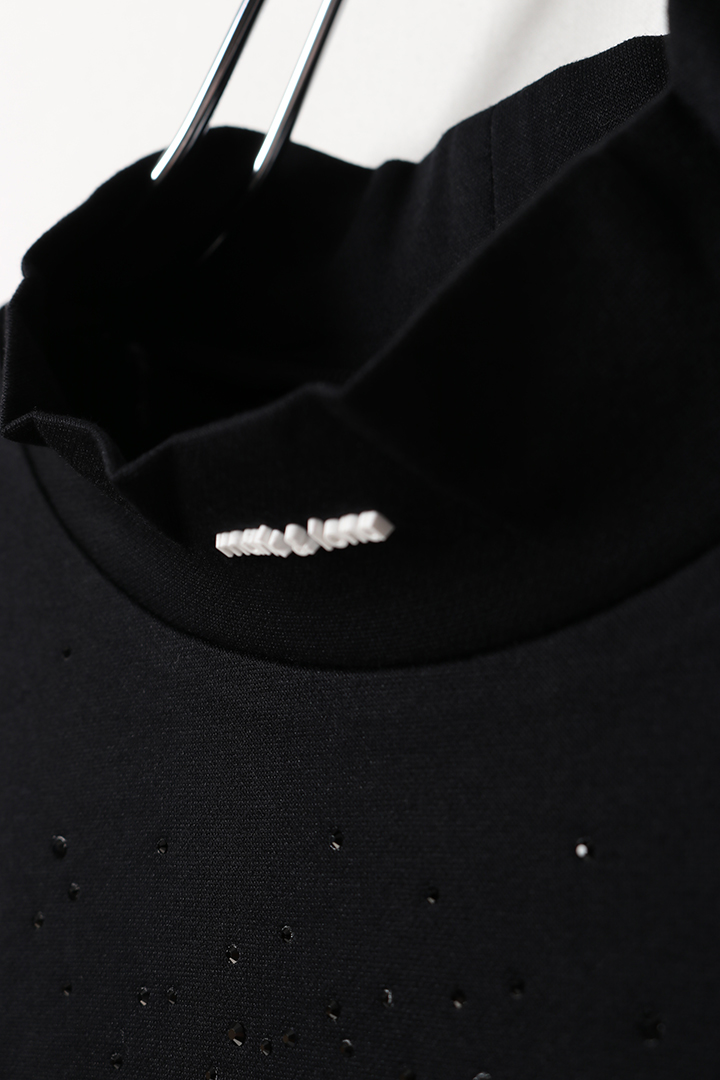 スカルとクリスタルストーンの煌めきが印象的な、ラグジュアリーかつ高機能なモックネックTシャツ。