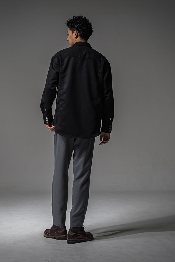 シルエットは股上が深く、ゆとりのあるワタリ、緩やかにテーパードさせています。