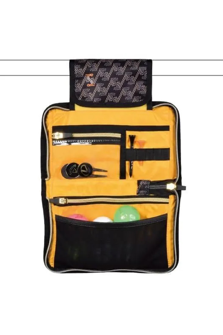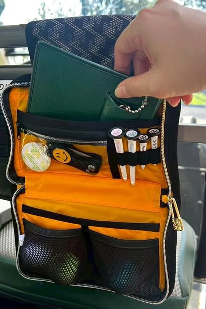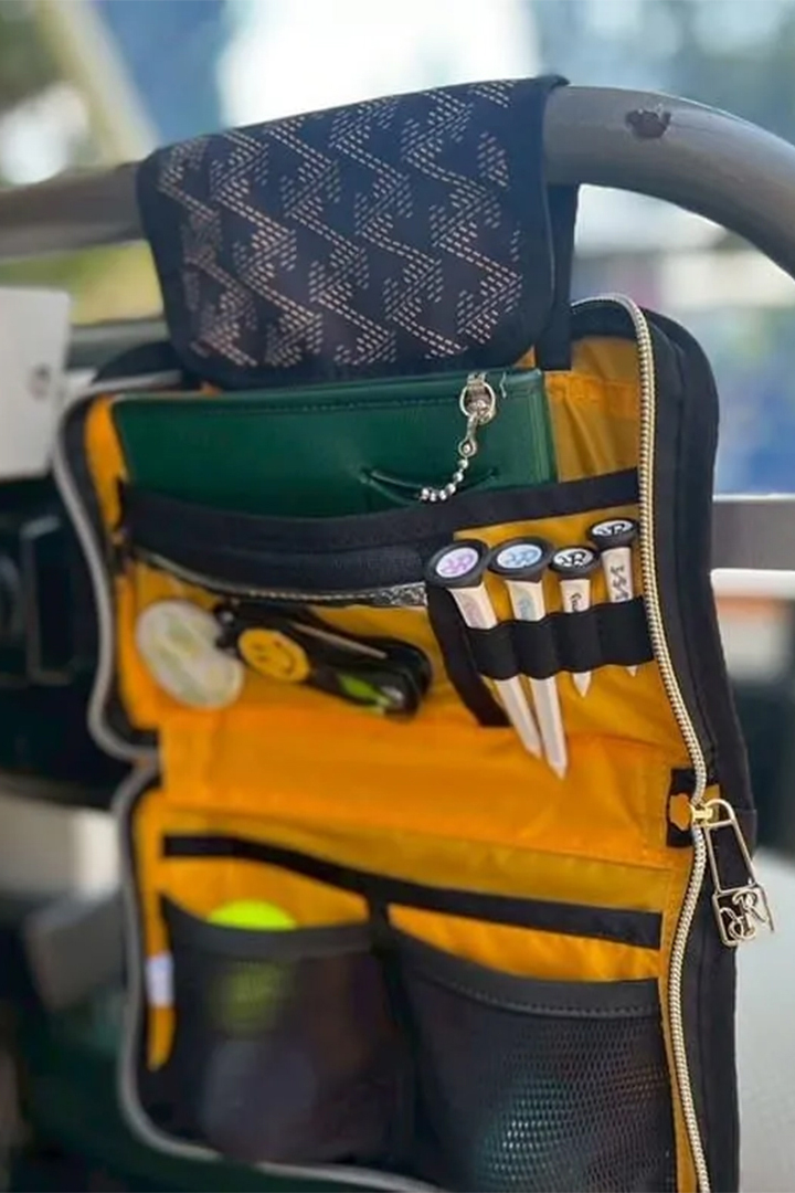 ゴルフ前日に、必要なモノをポーチに準備して当日はゴルフカートの後部座席前のバーに吊るしてご使用いただけます。