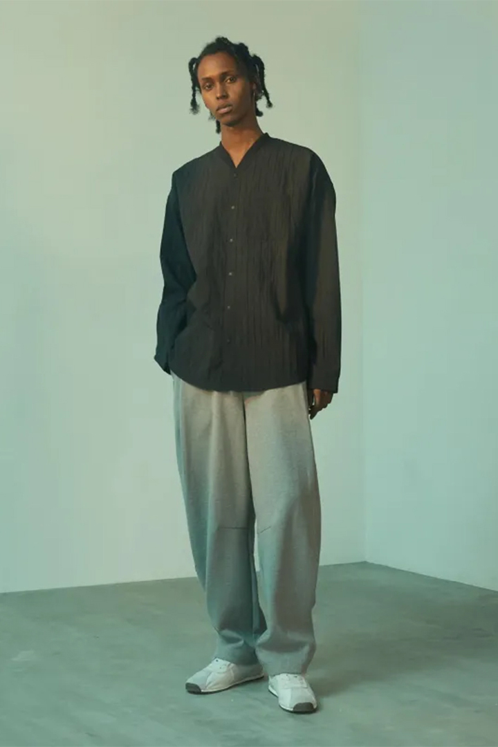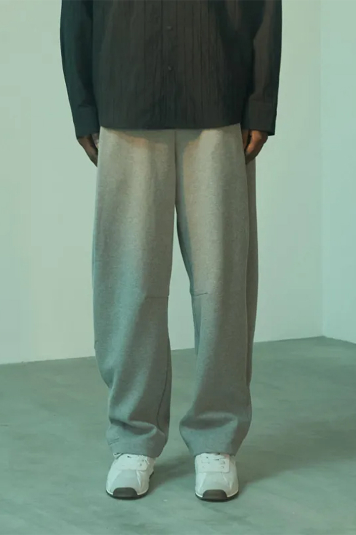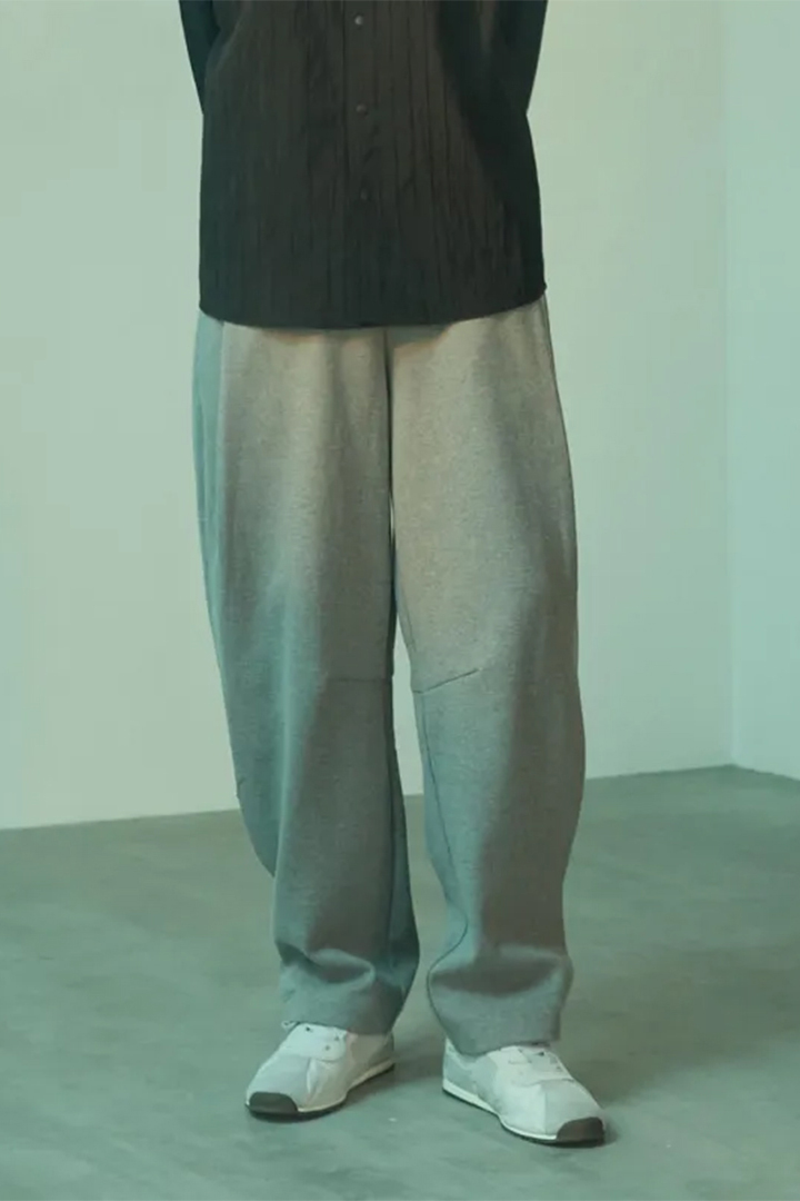 カジュアルな印象の従来のスウェットパンツをモード感のある雰囲気に仕上げています。