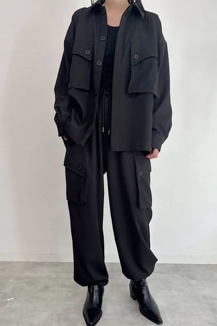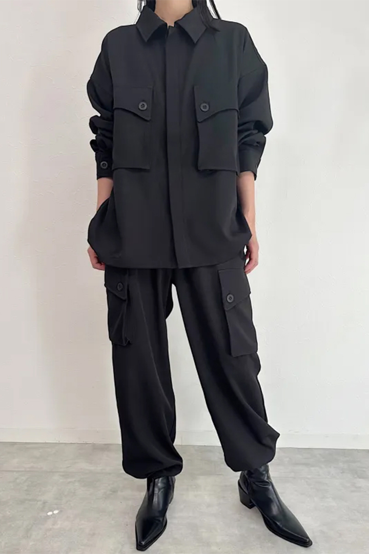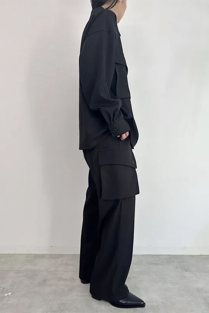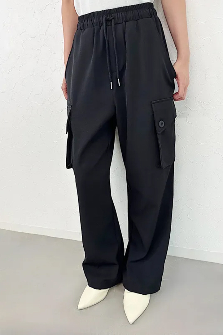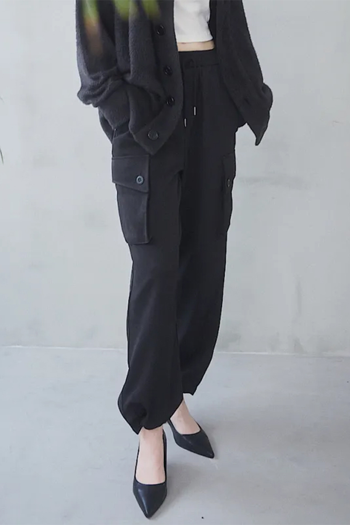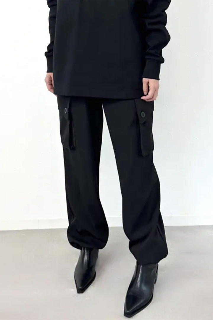 大胆なカッティングの立体ポケットがポイントのカーゴパンツ。裾を絞れるドロスト仕上げにより、丈感を調節して履いていただけます。裾のゴム紐は内側に隠れるように仕上げ、滑らかな落ち感のある素材を使用することで、ラフになりすぎず、モードな雰囲気に仕上げています。ストレッチの入った伸縮性のある素材なので履き心地も抜群。同素材のポケットシャツとセットアップでの着用もお勧めです。