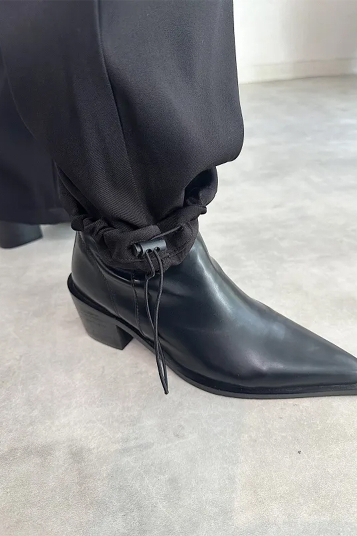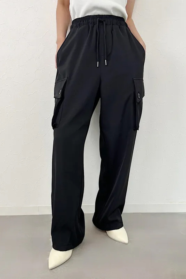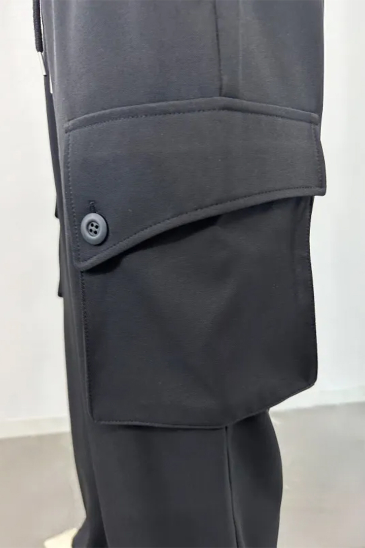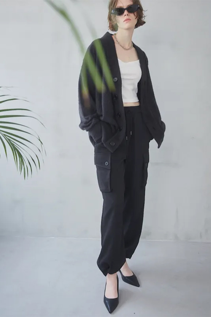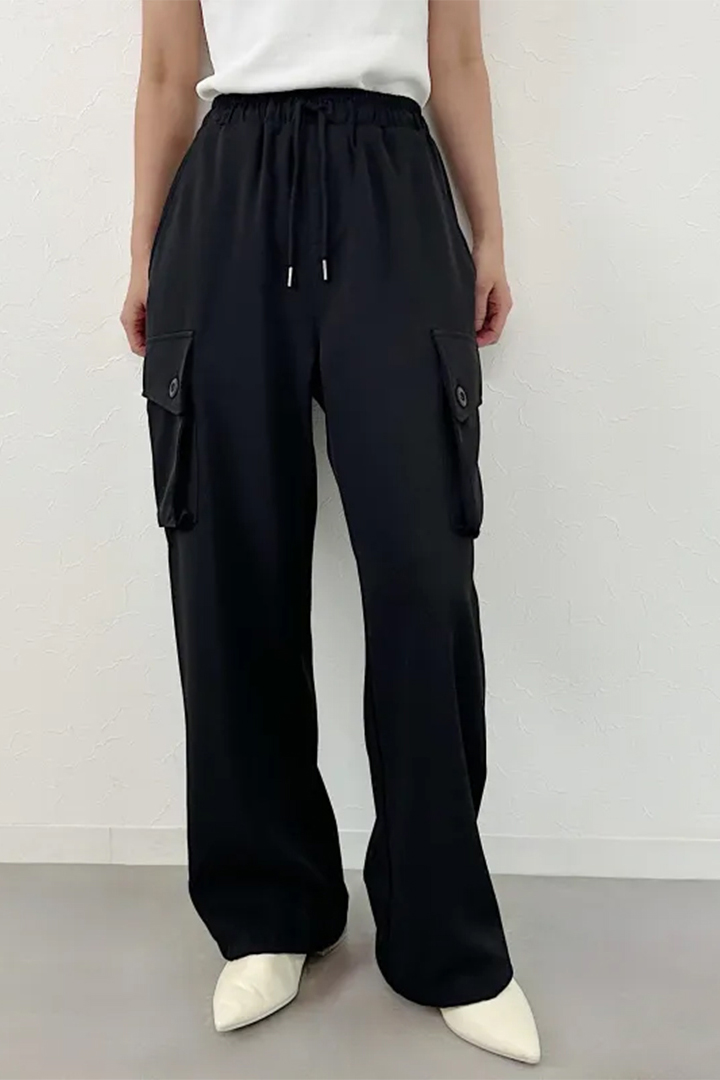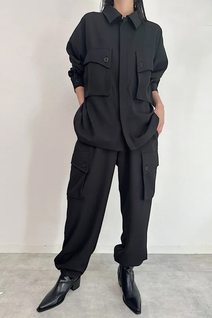 大胆なカッティングの立体ポケットがポイントのカーゴパンツ。裾を絞れるドロスト仕上げにより、丈感を調節して履いていただけます。裾のゴム紐は内側に隠れるように仕上げ、滑らかな落ち感のある素材を使用することで、ラフになりすぎず、モードな雰囲気に仕上げています。ストレッチの入った伸縮性のある素材なので履き心地も抜群。同素材のポケットシャツとセットアップでの着用もお勧めです。