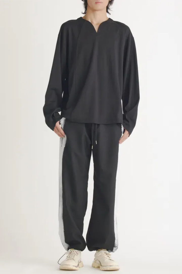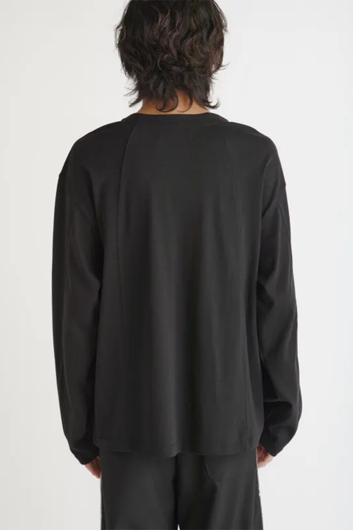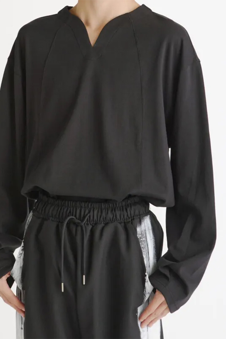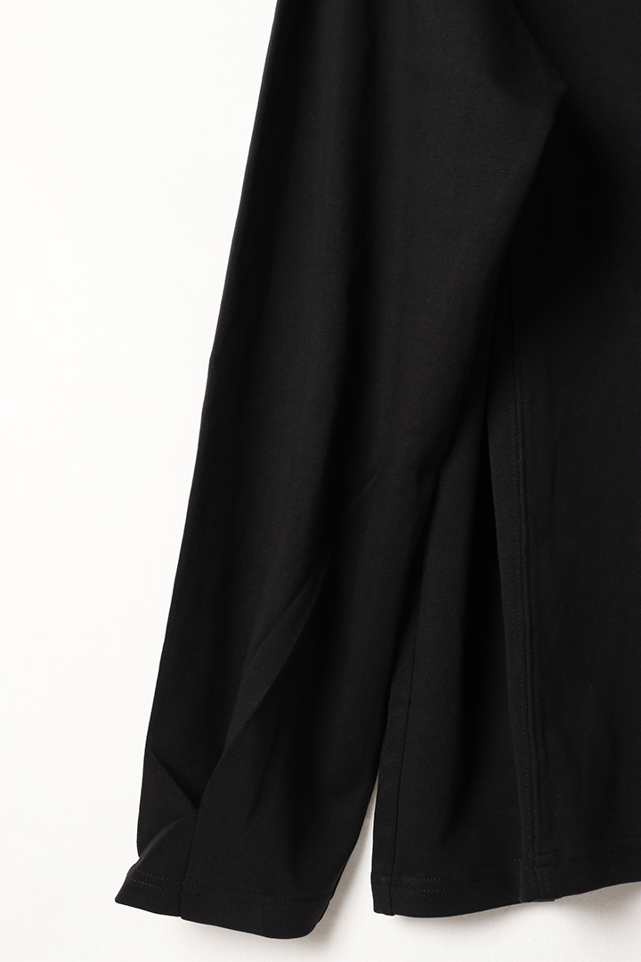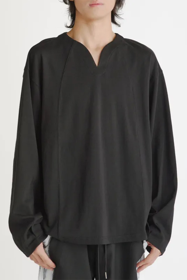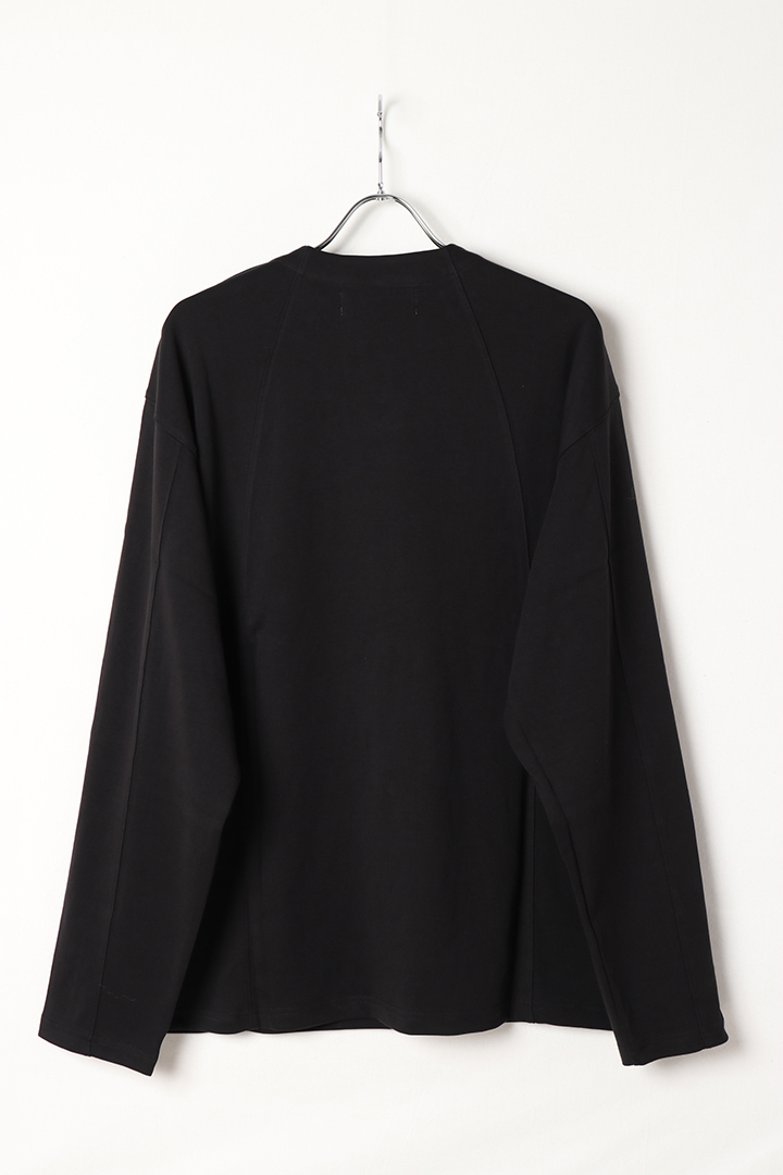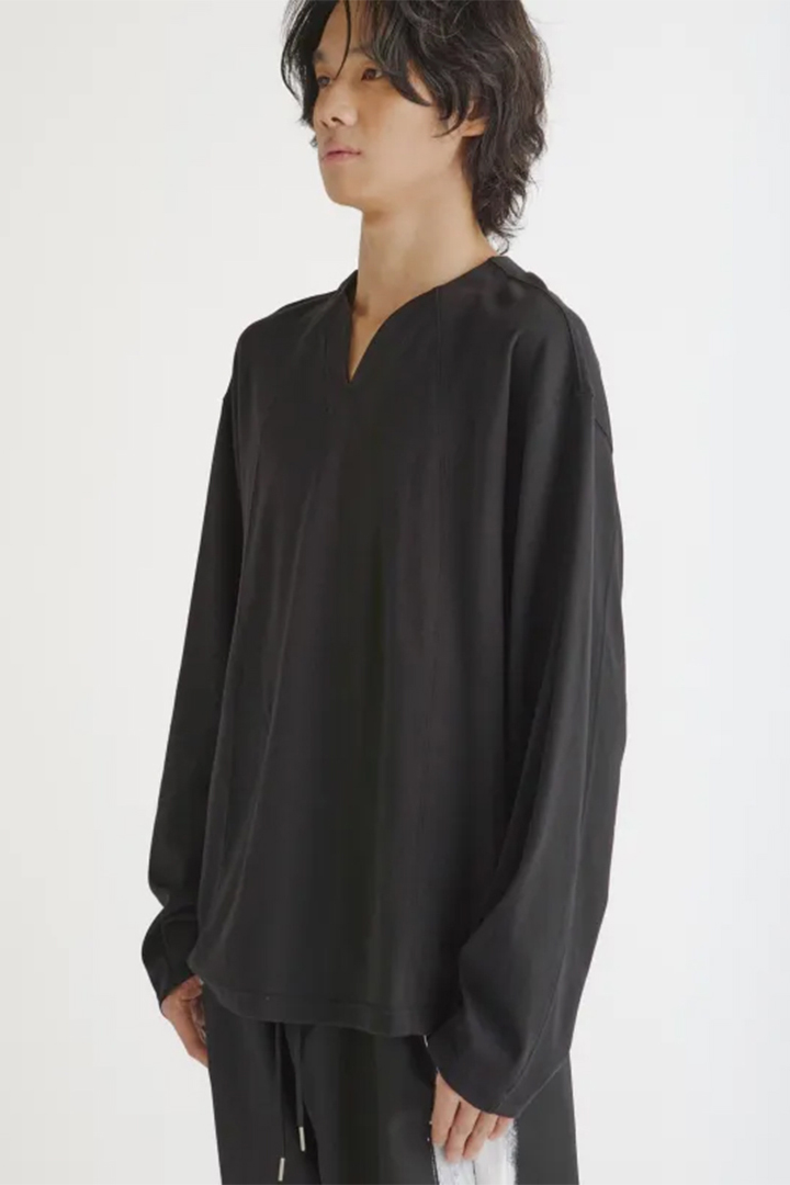 緩やかなネックラインと袖口にかけて立体的なパターンで仕上げたロングスリーブトップス。程よい肉厚で上質な素材感。すっきりとした首あきが立体パターンのオーバーサイズでもラフになりすぎず、モード感と洗練された印象をプラスする一枚。柔らかな着心地で、男女問わず、デイリーに着ていただけます。