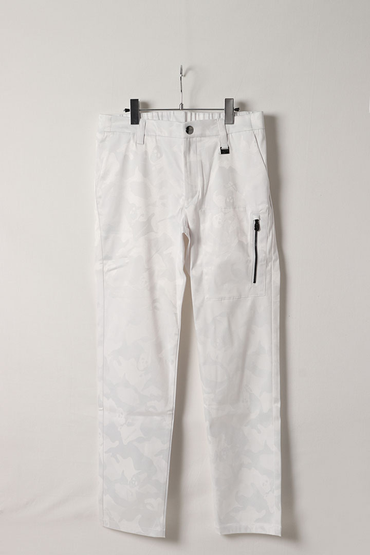 カモフラージュパターンのストレッチジャカード素材を使用したロングパンツ。上品な光沢感と適度なストレッチ性を兼ね備えた季節を問わず活躍する万能アイテム。