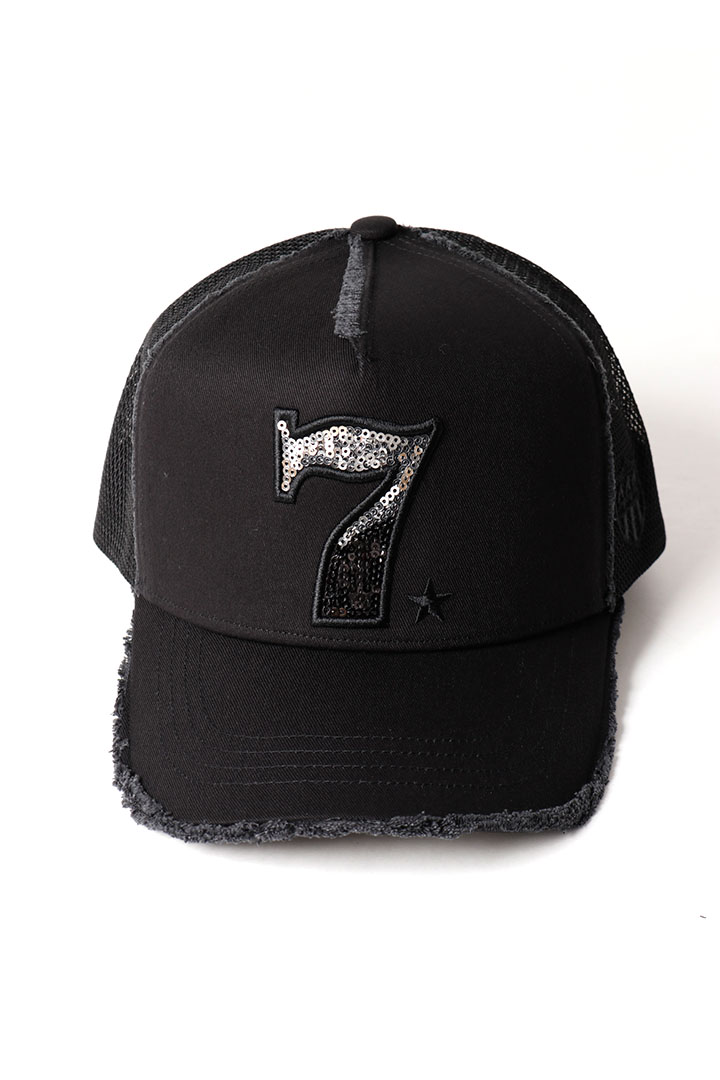 「7」のエンブレムはブラック刺繍にシルバーとブラックのツートーンスパンコール。