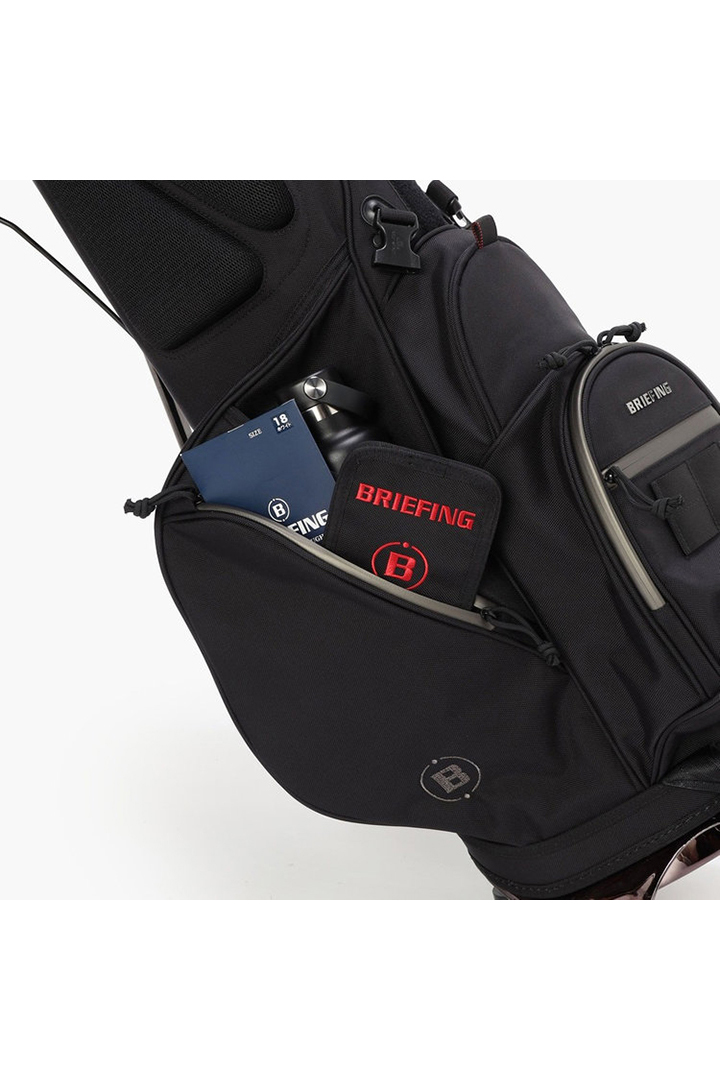 ・レインウェアなどの嵩張るアイテムの収納に便利な大型ポケット、ゴルフボール1ダースを収納できるポケット、保冷機能を備えたボトルポケットなど多数配置。