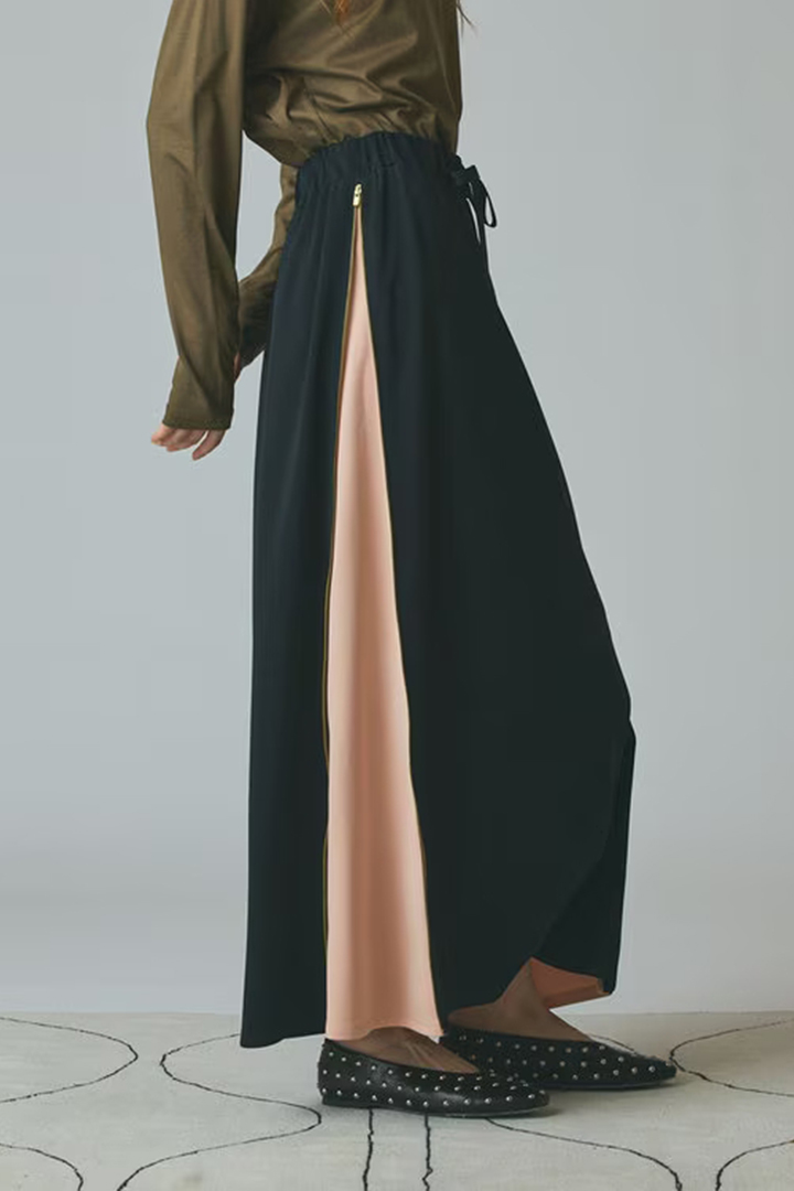 両サイドについたファスナーを開ける事でバイカラーのマチが覗き、シルエットを調節できる遊び心溢れるデザインです。