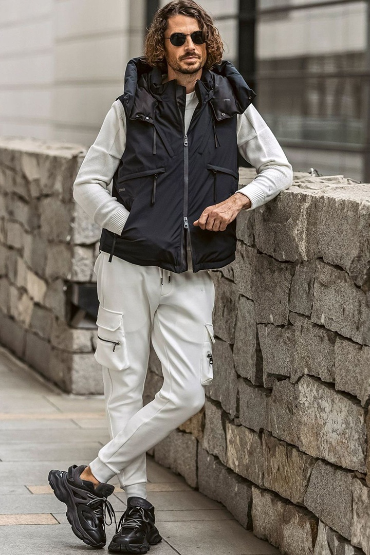 胸元に差し込んだファスナーポケットもシンプルな中にエッジを効かせるポイントになっています。
