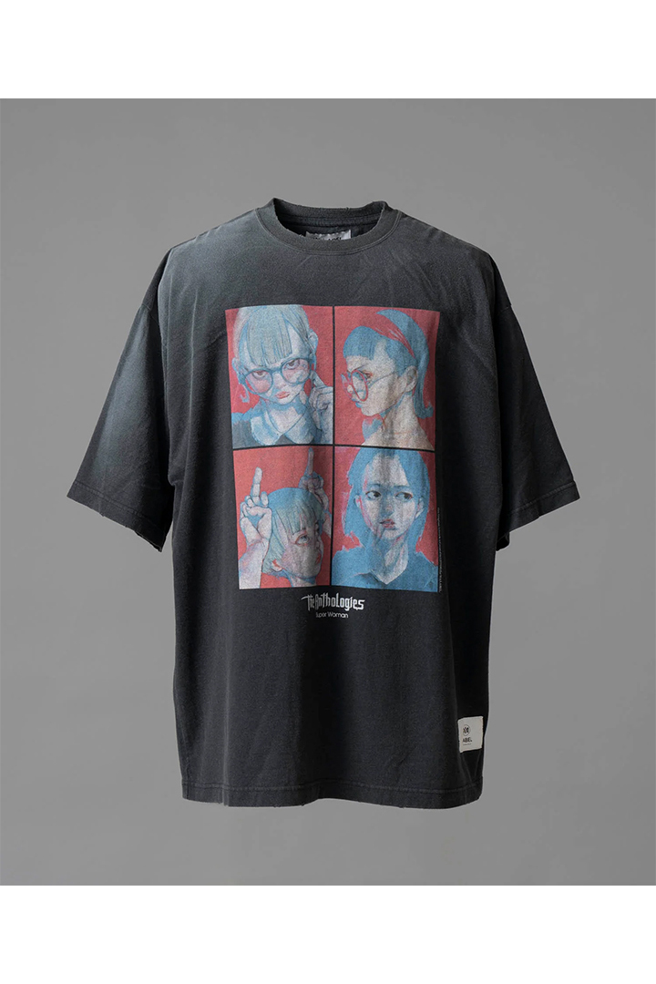 プリントは、インクジェットと半ラバー(顔料とラバーを混ぜる手法)をフロントとバックで使い分け、ボディ加工を施す前にプリントすることでリアルな古着のような掠れとフェード感を演出。