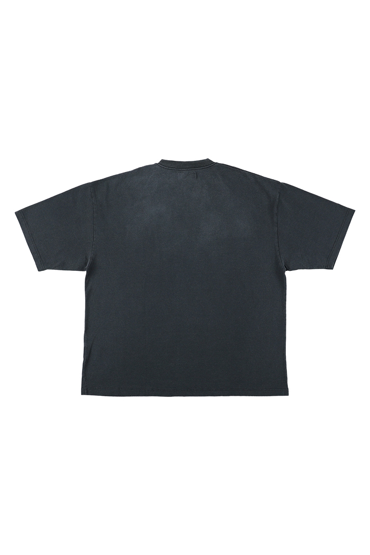 プリントは、インクジェットと半ラバー(顔料とラバーを混ぜる手法)をフロントとバックで使い分け、ボディ加工を施す前にプリントすることでリアルな古着のような掠れとフェード感を演出。