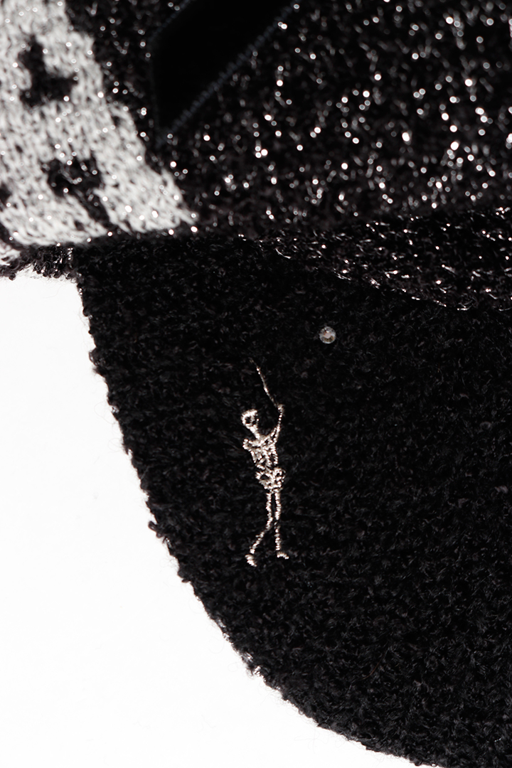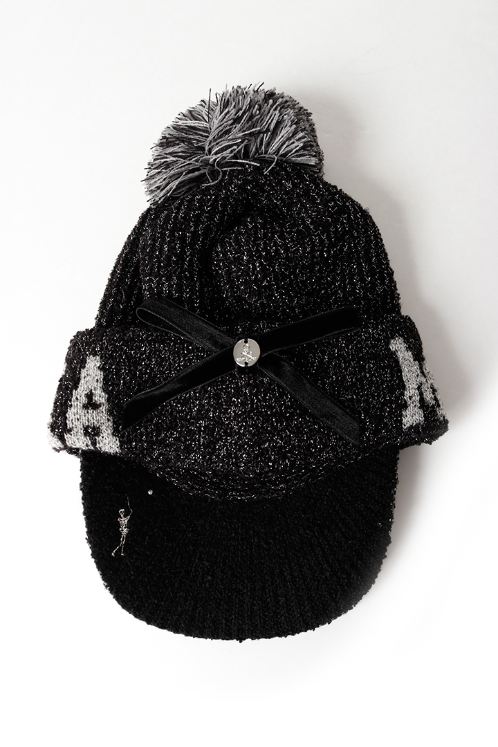 ・繊細なウール糸をベースに、スパンコールヤーンとラメ糸を引き揃えて編み上げたツバ付きキャップデザイン
