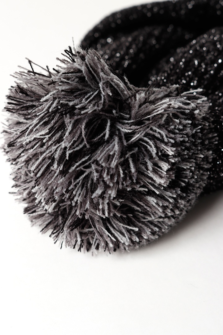 ラメ糸とスパンコールの繊細な輝きが印象的な、フェミニンで華やかな梵天付きニットキャップ。