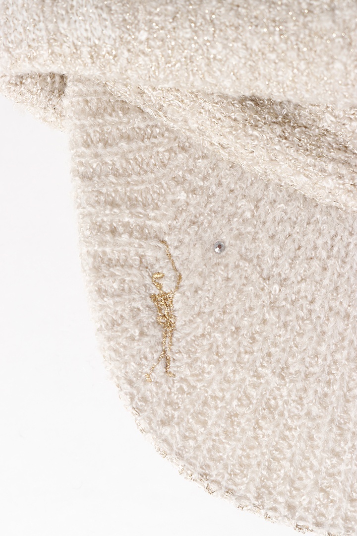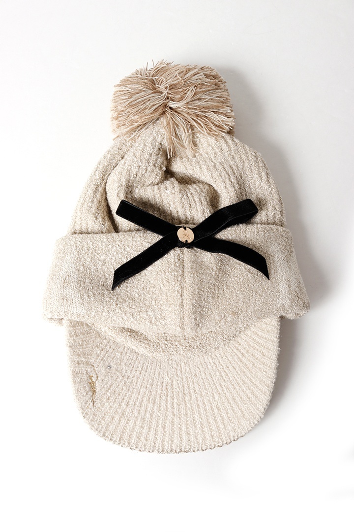 ・繊細なウール糸をベースに、スパンコールヤーンとラメ糸を引き揃えて編み上げたツバ付きキャップデザイン