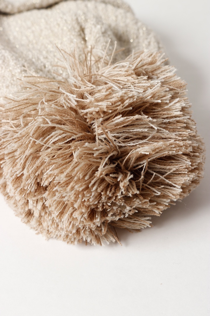 ラメ糸とスパンコールの繊細な輝きが印象的な、フェミニンで華やかな梵天付きニットキャップ。