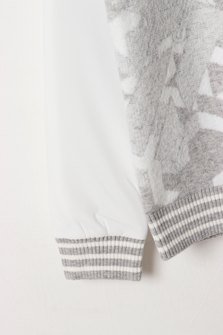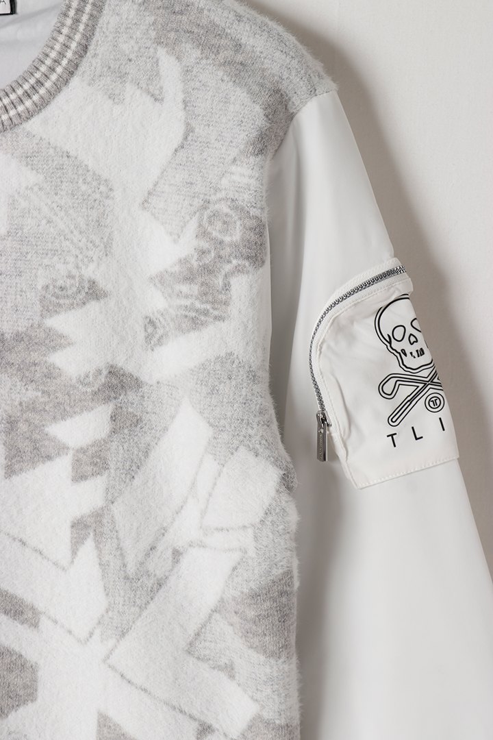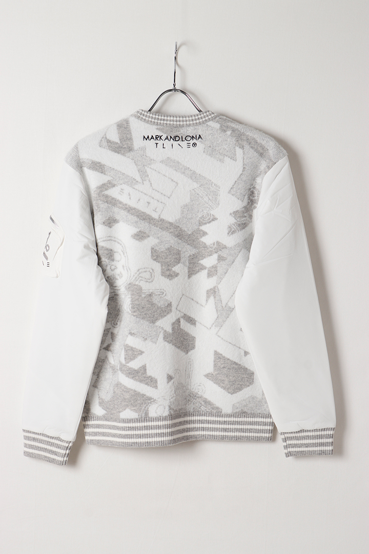 ジオメトリックカモフラージュパターンが印象的な、ニットと中綿素材コンビネーションのハイブリッドプルオーバー。