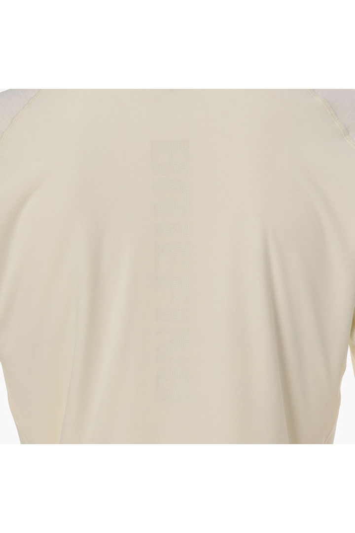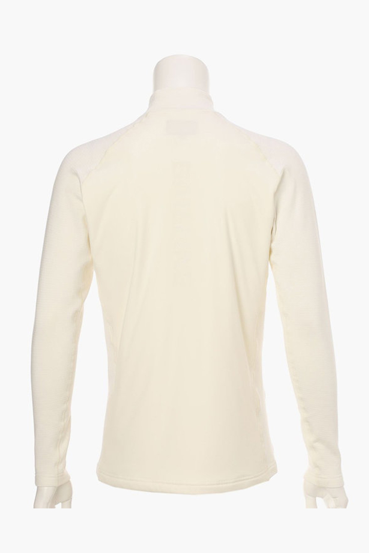 ・襟はタイトフィットなハイネックにし、肩の可動域が広いラグランスリーブ切り替えを採用しています。