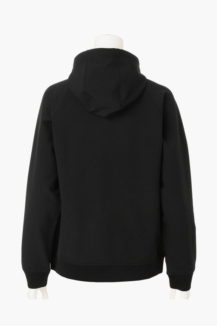 ・首元を優しく包むフィット感の襟腰高めのフードは、ジップを上まで締めることで衣服内部へ風が侵入するのを防ぎます。