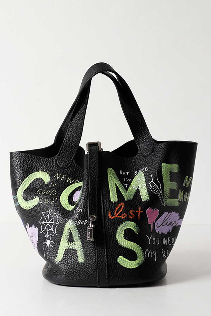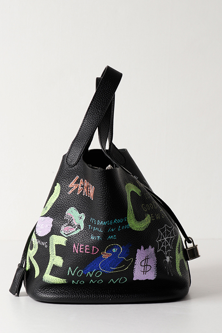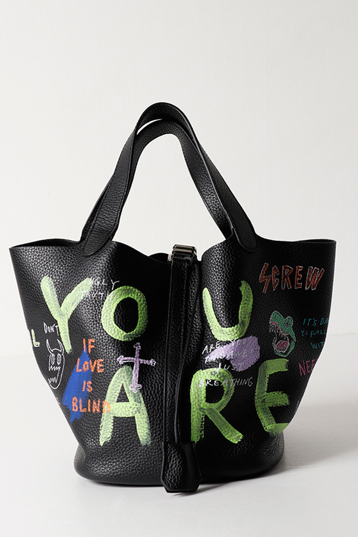 アーティスト、乾シンイチロウ(Shinichiro Inui)によりハンドペイントが施されたレザーバッグ。