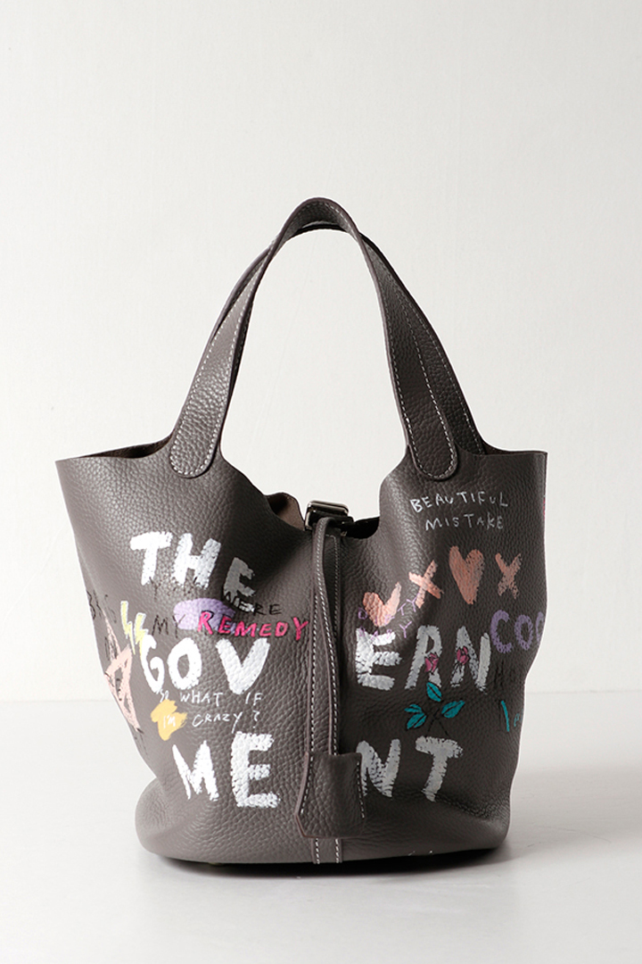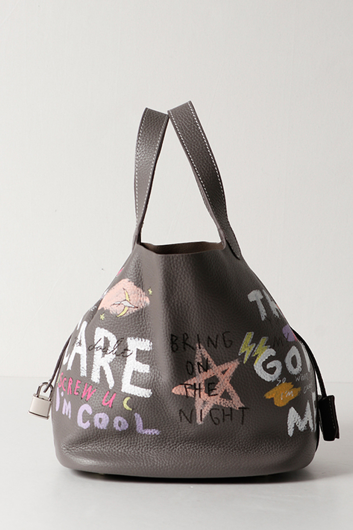 アーティスト、乾シンイチロウ(Shinichiro Inui)によりハンドペイントが施されたレザーバッグ。