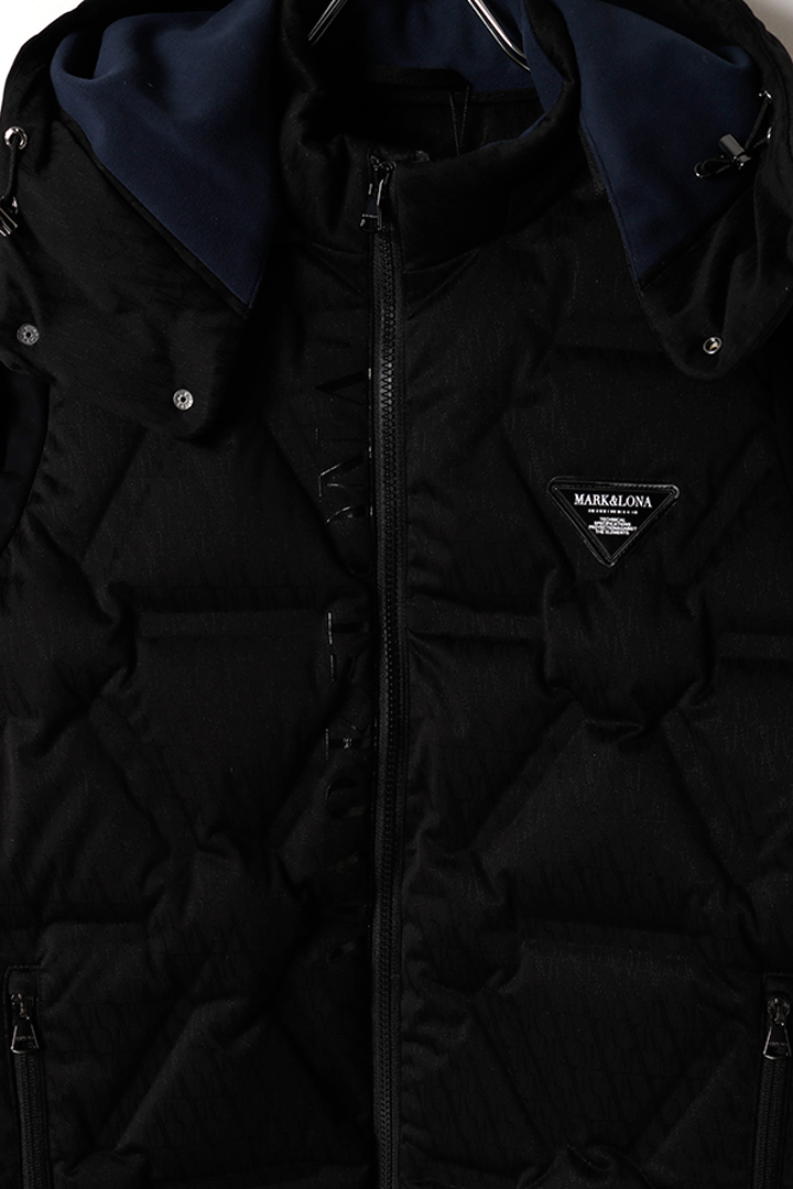 ・フロントとバック、フードはロゴのグラフィックジャカードに、トライアングルを象ったシームレス圧着加工のダウン素材を使用