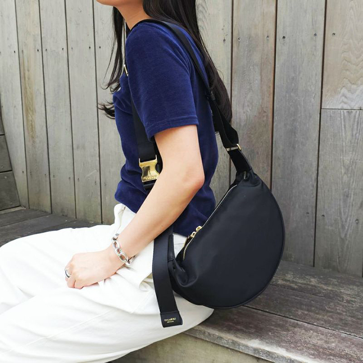 弱撥水性のあるカジュアルなナイロン素材に金具のゴールド使いが女性らしいボディバッグ。
