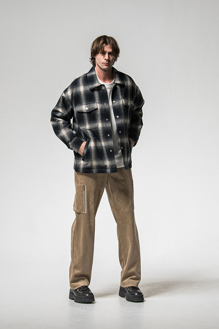 シルエットは腰、ヒップ周りはややタイト、腿周りからゆとりを持たせストンと落とした緩めのストレートシルエット。裾にゴムを入れドローコードも中に入れ、デニムのような前開き仕様