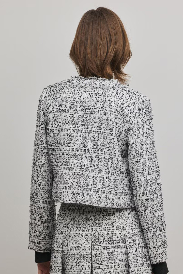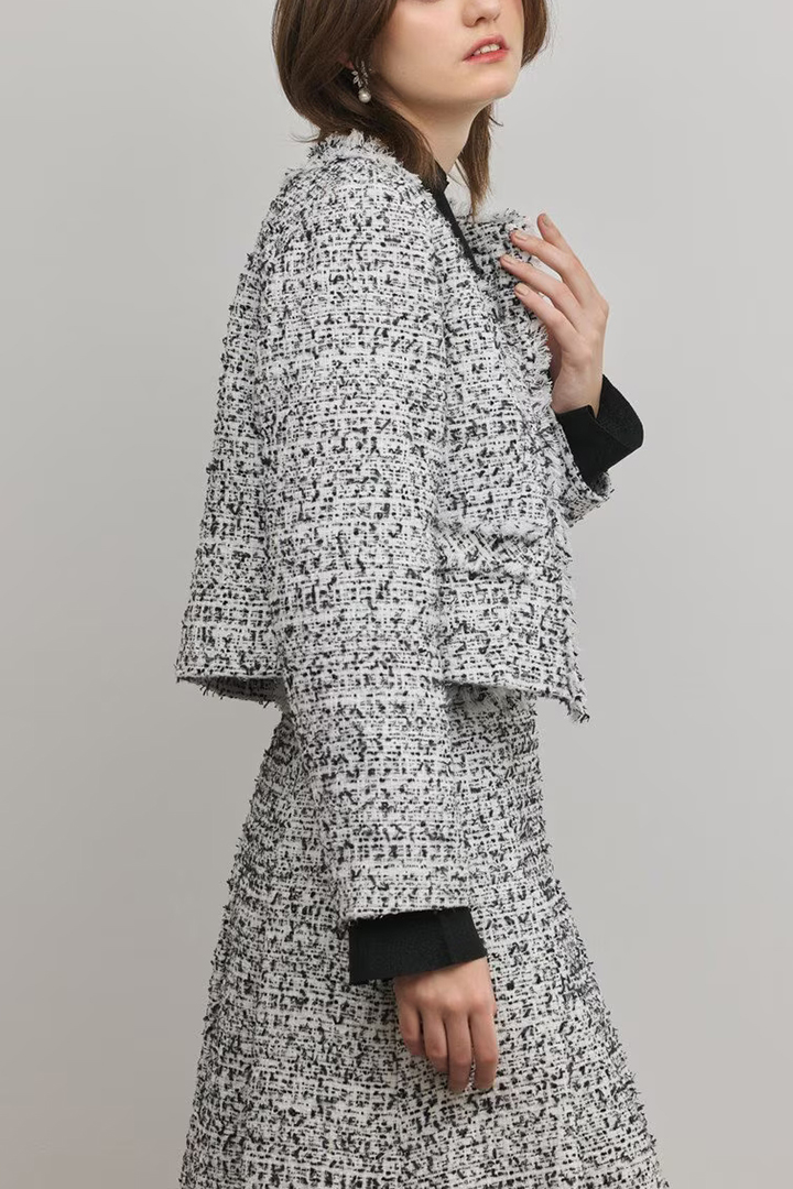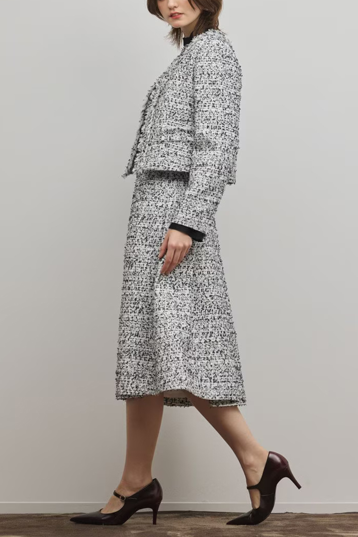春のセレモニーシーンにぴったりな、華やかな意匠糸を使用したツイードジャケット。
